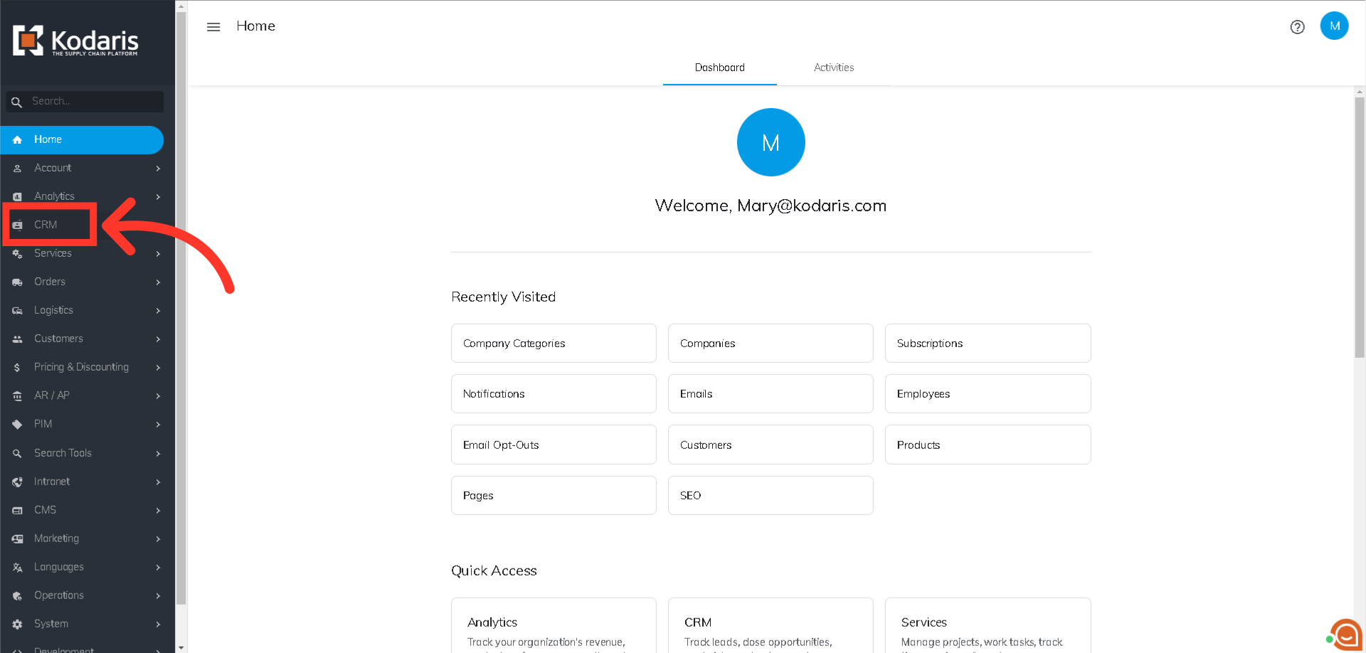 Select "Companies". In order to access "Companies" you will need to be set up either as an "administrator" or a "superuser", or have the appropriate roles: "companyView and companyEdit", or "crmCompanyView and crmCompanyEdit". Just a reminder, "crmCompanyView and crmCompanyEdit" access only allows employees to view companies that are assigned to them.
