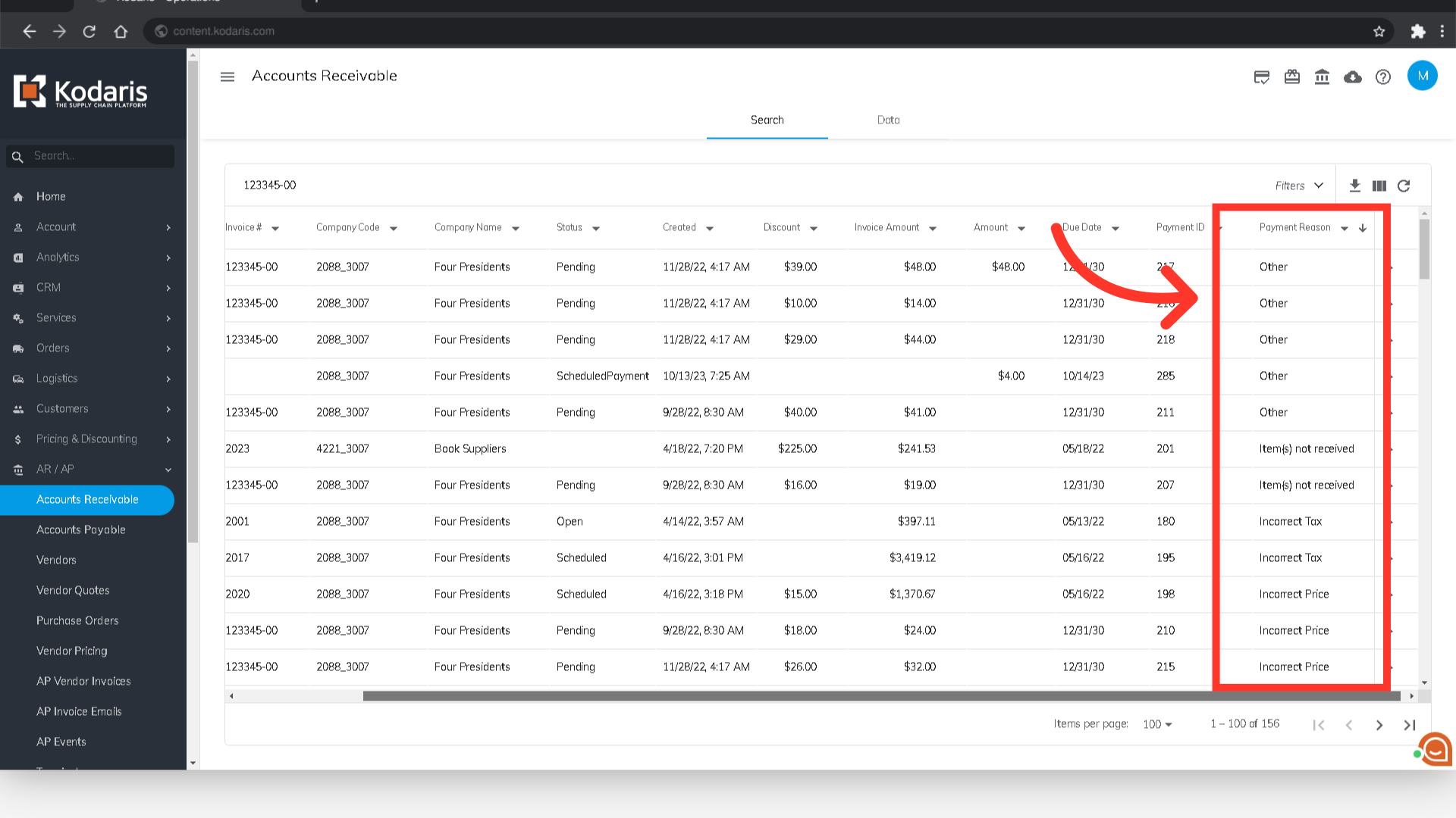 If you allow your customers to short pay invoices, you can also require them to select a reason for their short payment. You can view these short pay reasons in the operations portal by navigating to the "AR/AP" section.