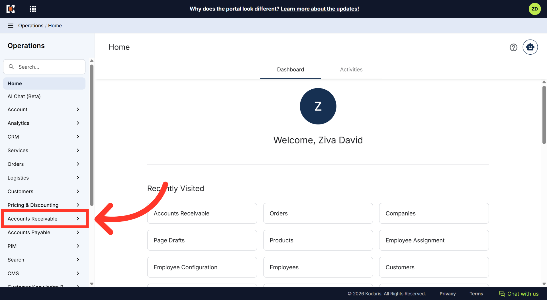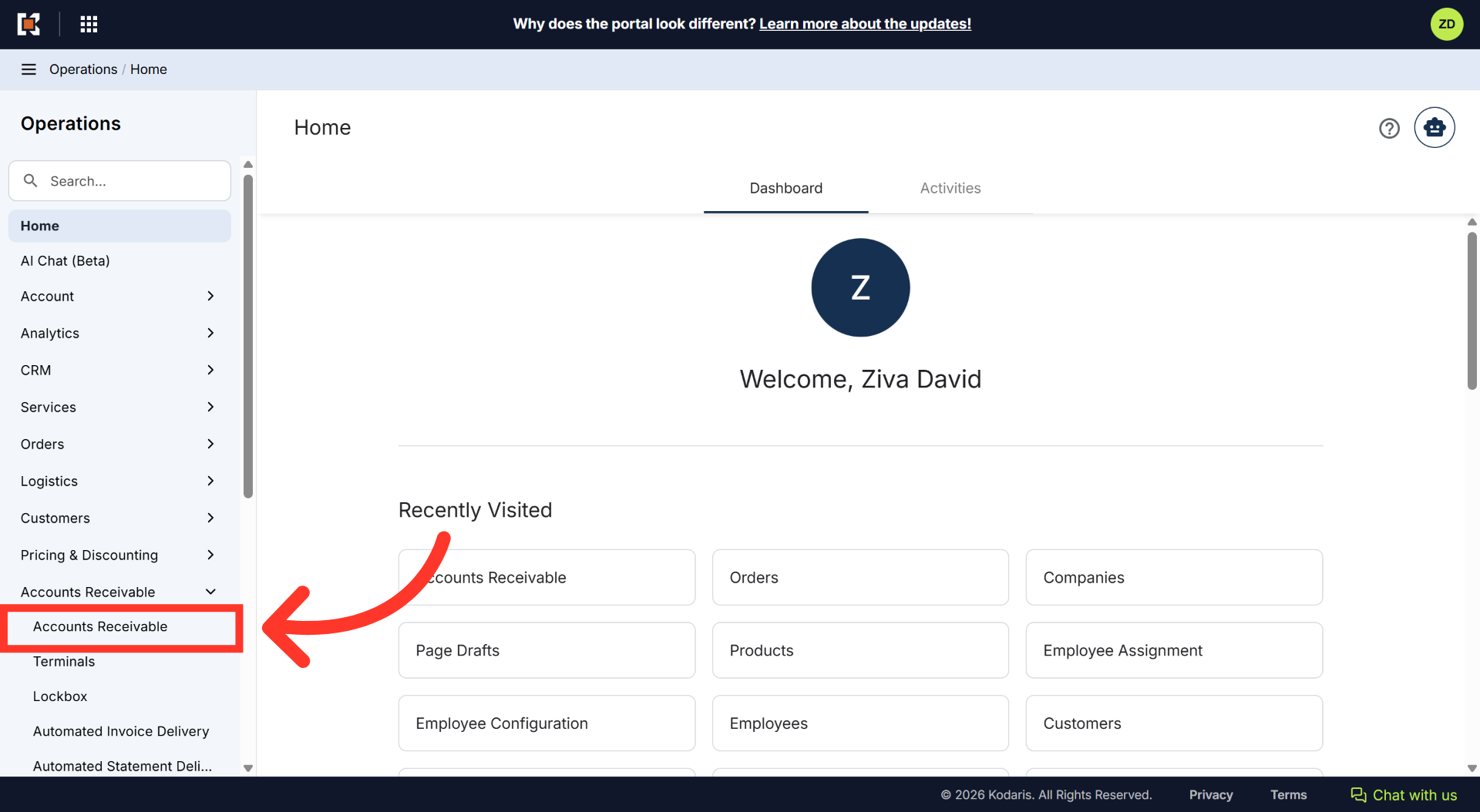 Then, click "Accounts Receivable". In order to access and update "Accounts Receivable" you will need to be set up either as an "administrator" or a "superuser", or "accountant" or have the following roles: "paymentEdit".