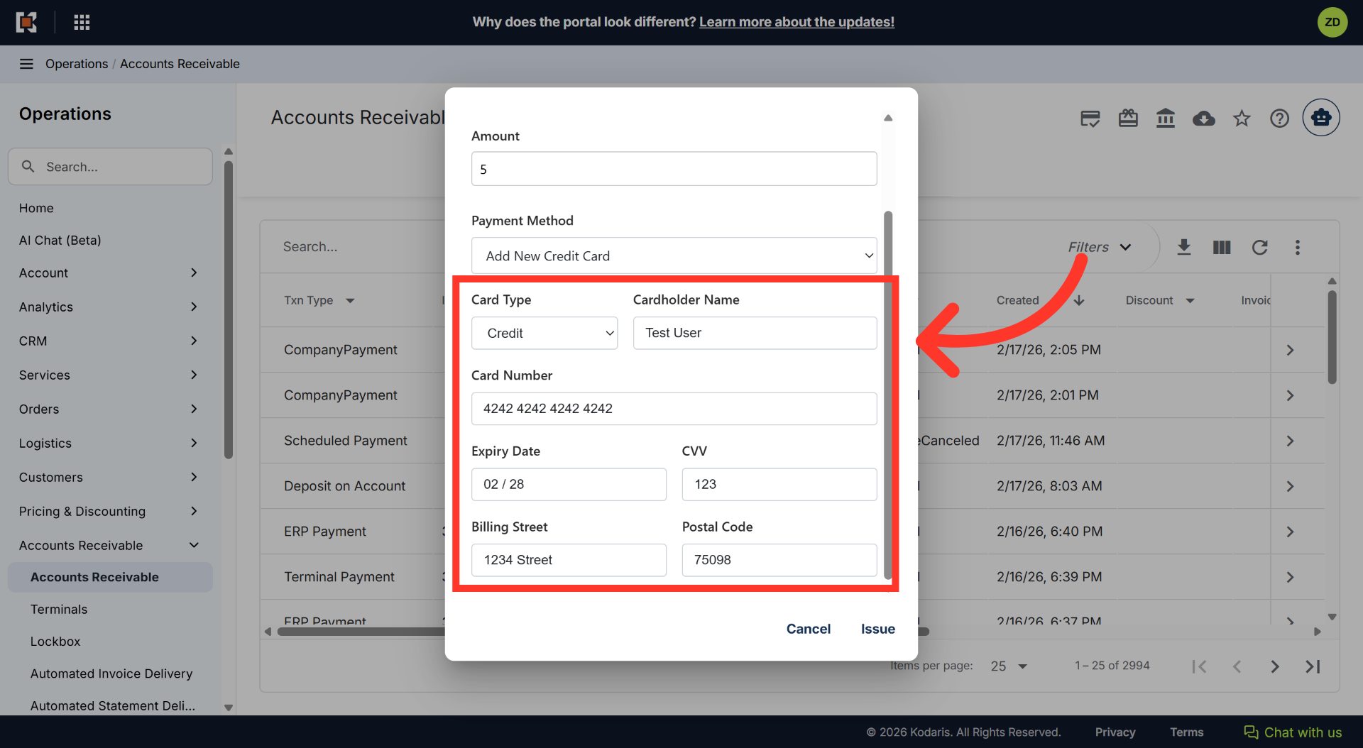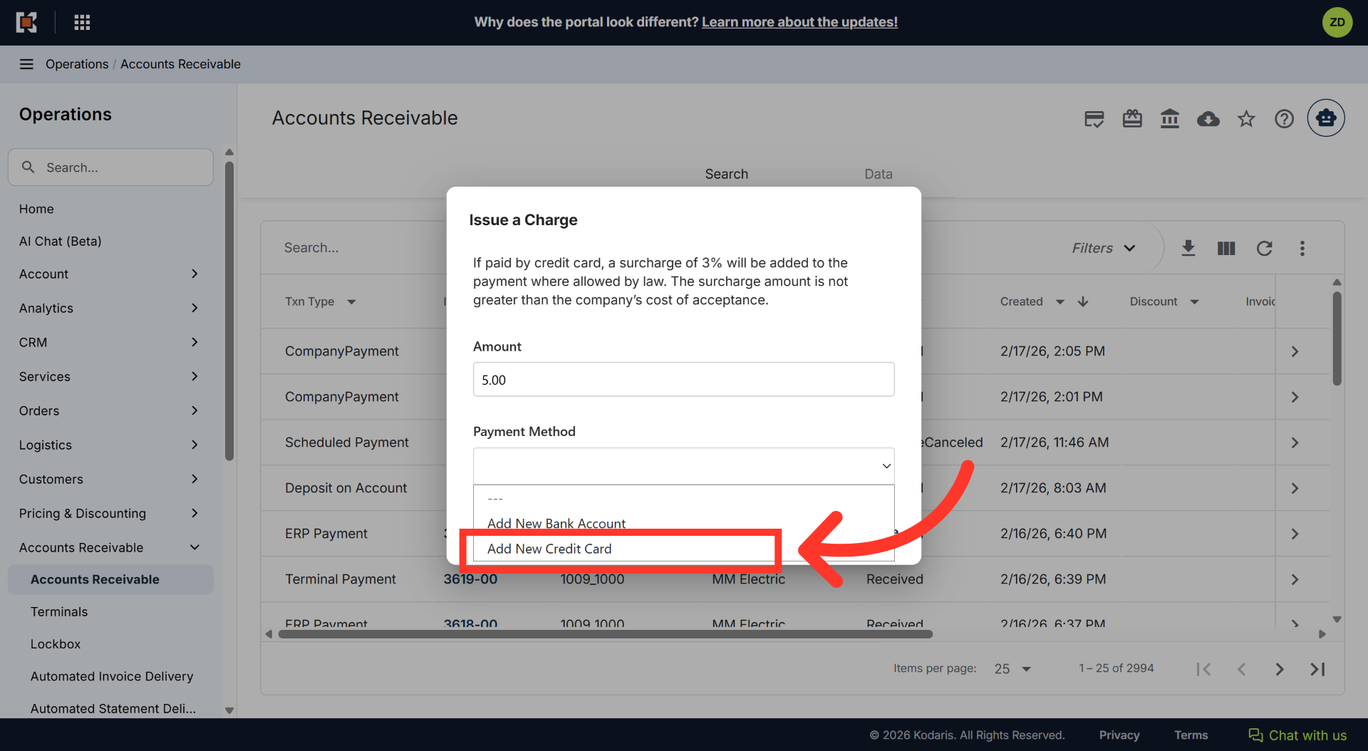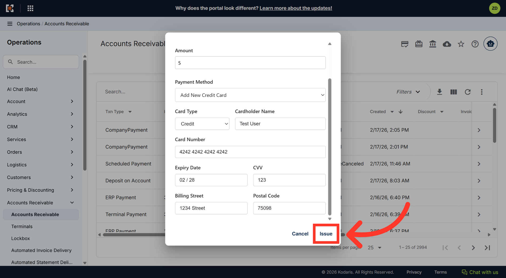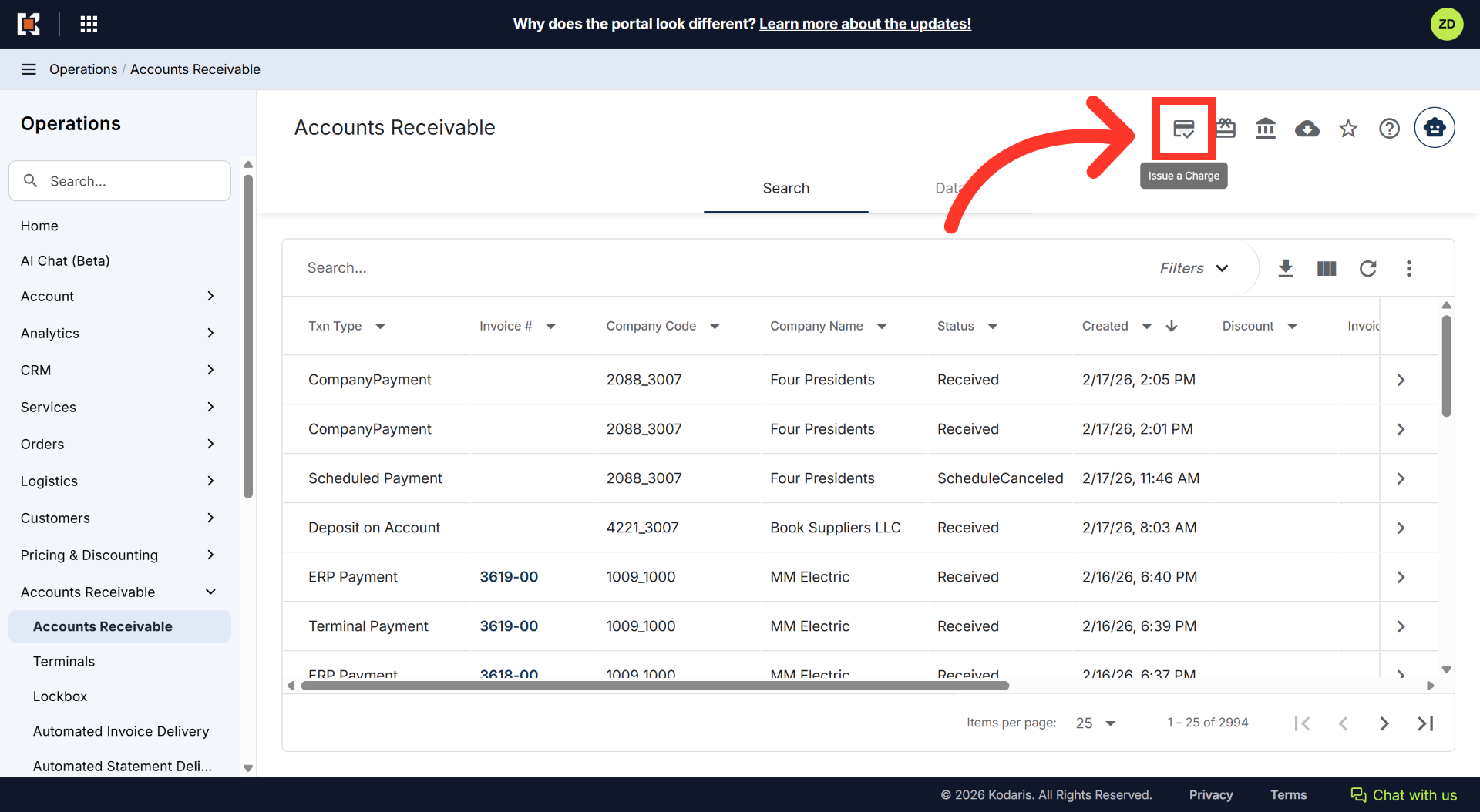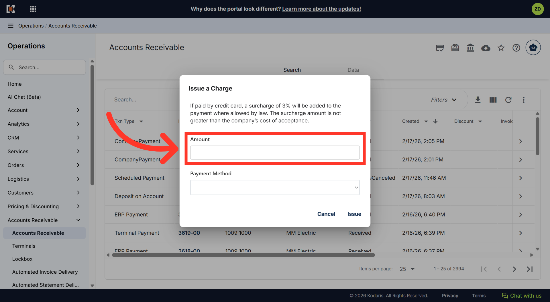 You can issue a charge to a credit card using the "Issue a Charge" feature in the Operations Portal. Note: Issuing a charge using this process does not tie the charge to a specific company record. To start, navigate to the "Accounts Receivable" section.