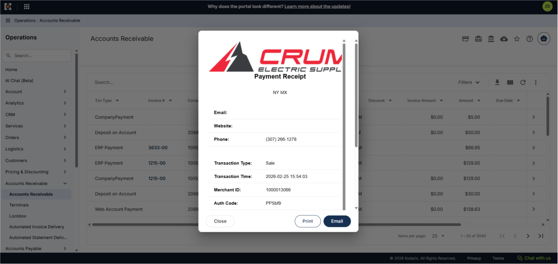 The receipt preview screen allows you to view receipt details and print or email a copy of the receipt.