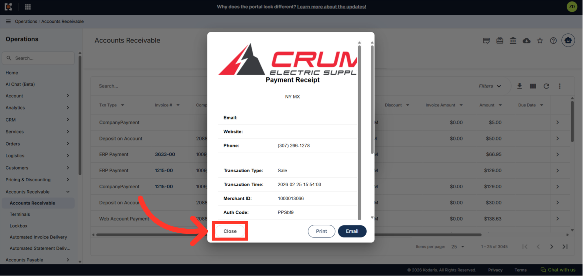 Click the "Close" button to close the screen and return to the Accounts Receivable screen.
