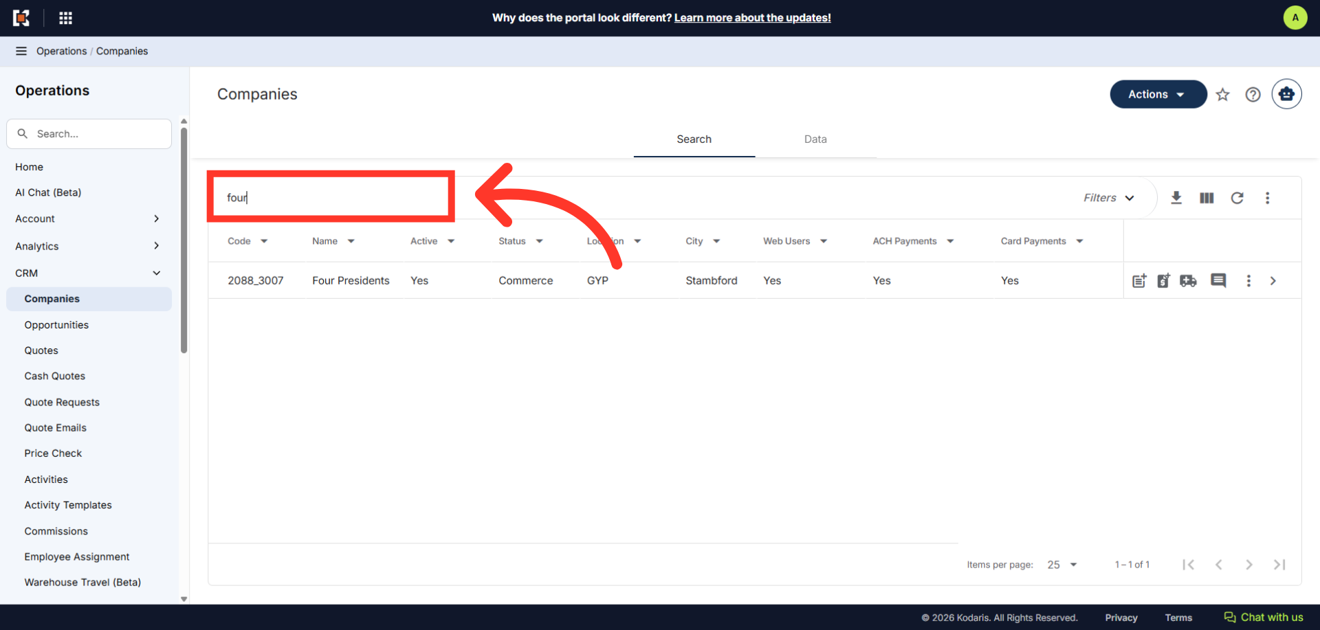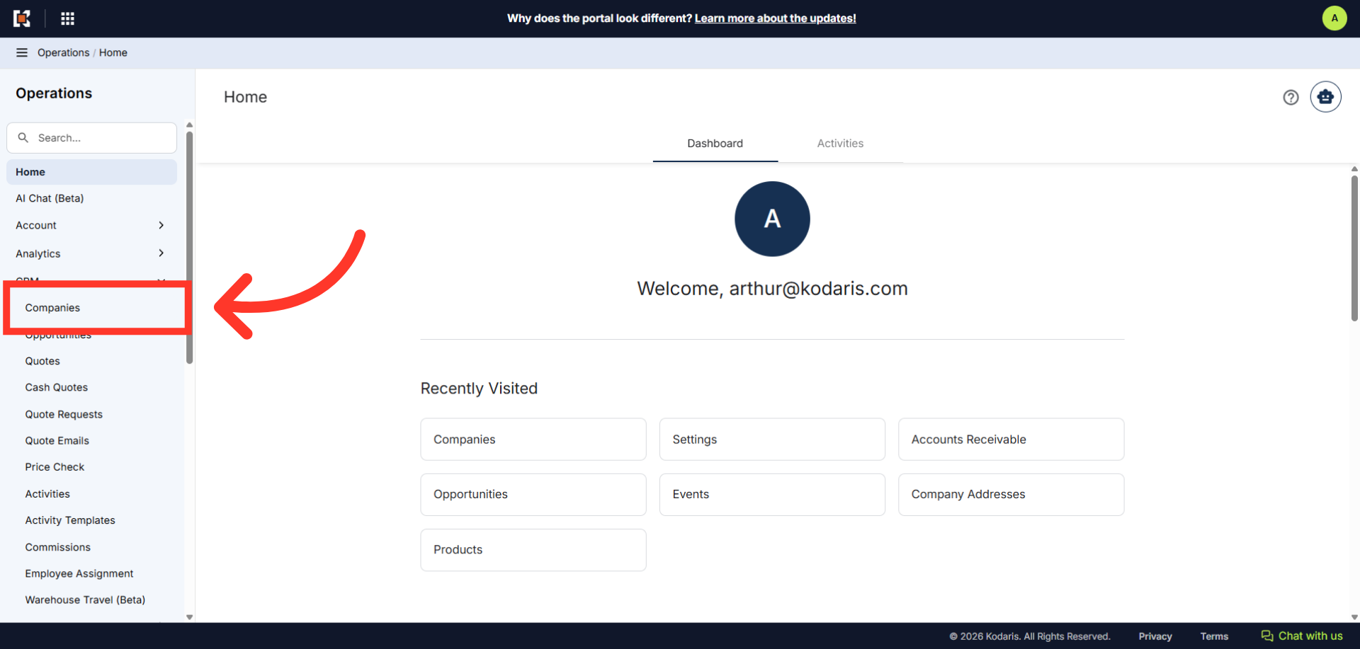Then, click "Companies". In order to access "Companies" you will need to be set up either as an "administrator" or a "superuser", or have the appropriate roles: “companyEdit", or “crmCompanyEdit". Just a reminder, "crmCompanyEdit" access only allows employees to access companies that are assigned to them.