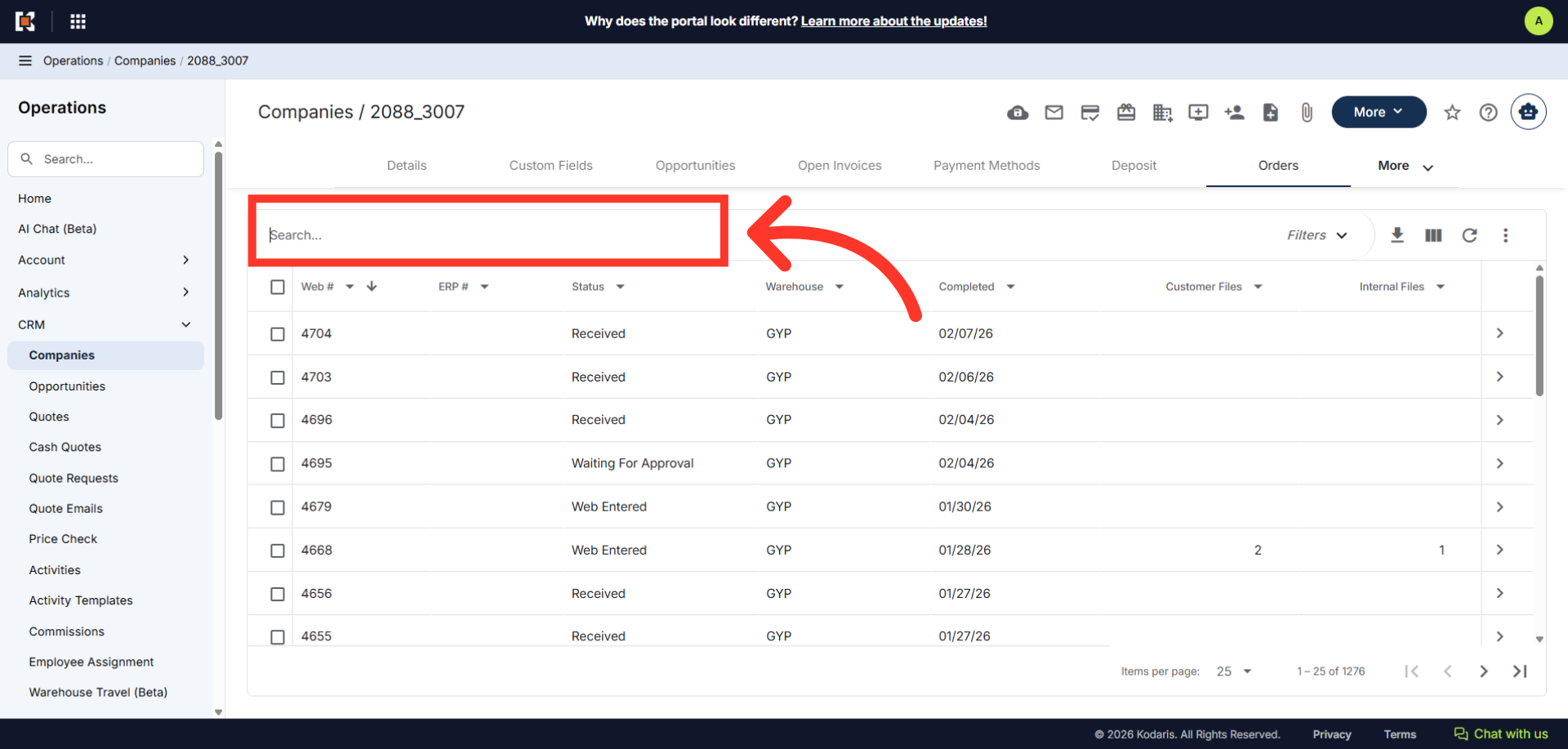 The companies "Orders" screen displays all orders associated with the company. Since we are going to access the "Internal Files" on an order, search for an order by entering the order number in the search box.