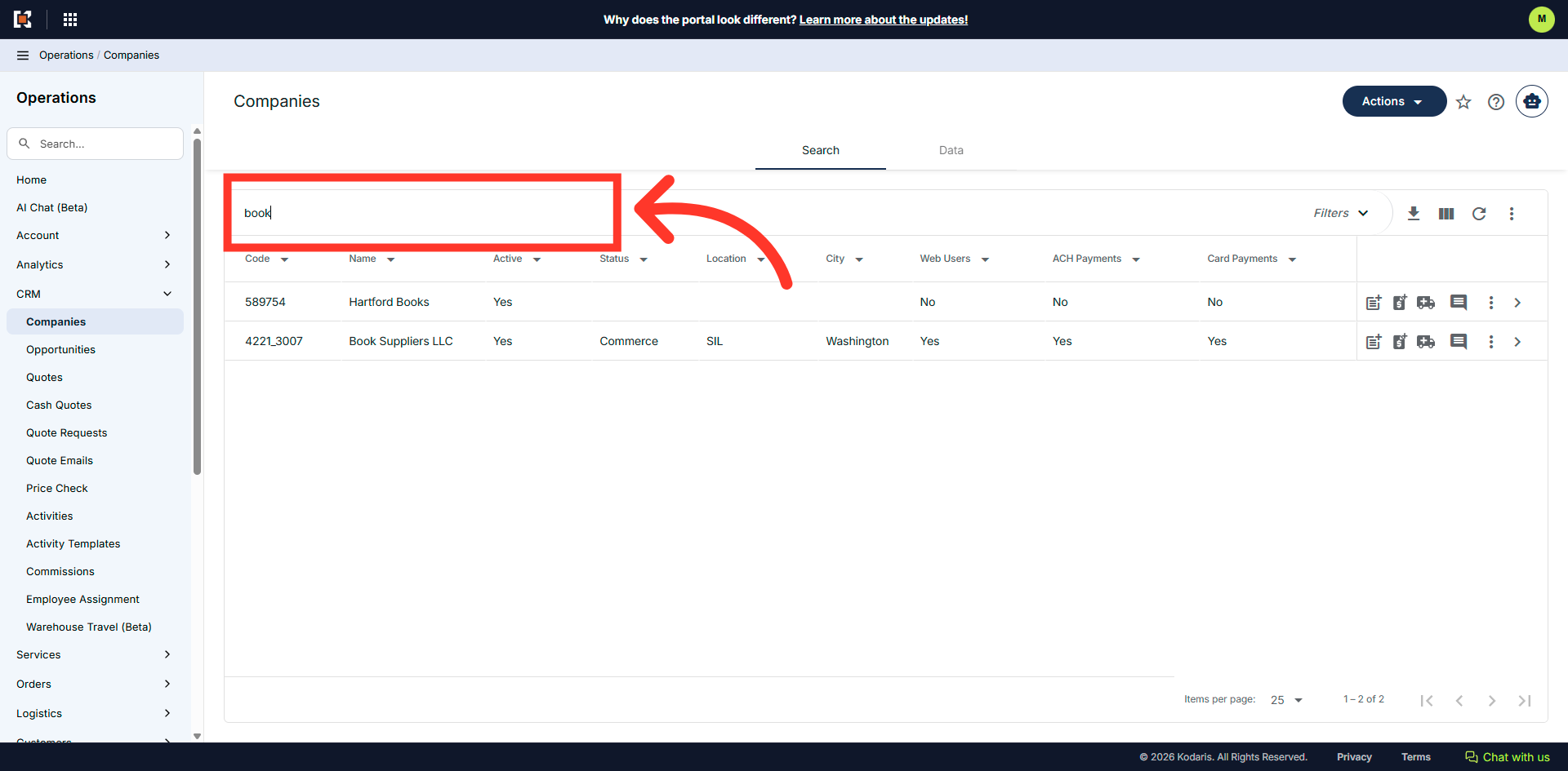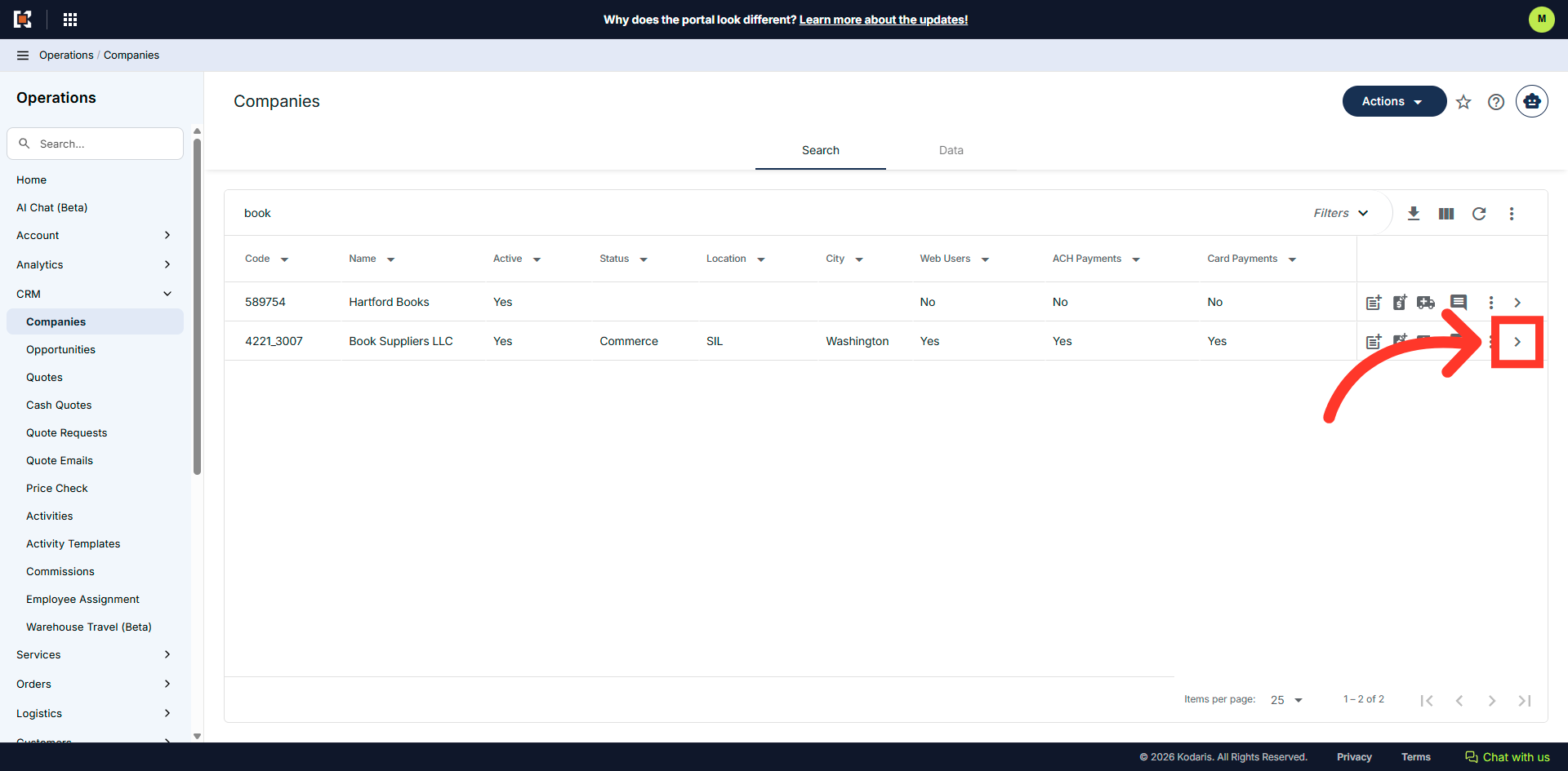 Click on "Companies". In order to access "Companies" you will need to be set up either as an "administrator" or a "superuser", or have the appropriate roles: "companyEdit", or "crmCompanyEdit". Just a reminder, "crmCompanyEdit" access only allows employees to access companies that are assigned to them.