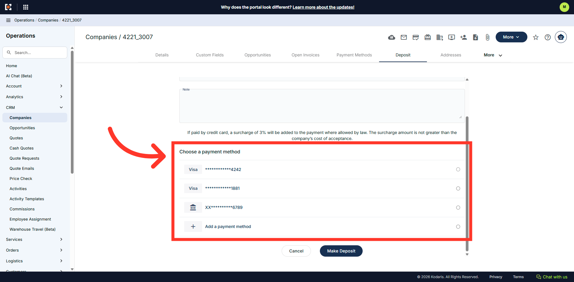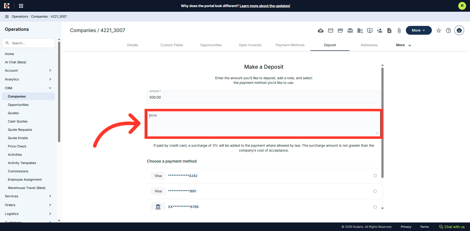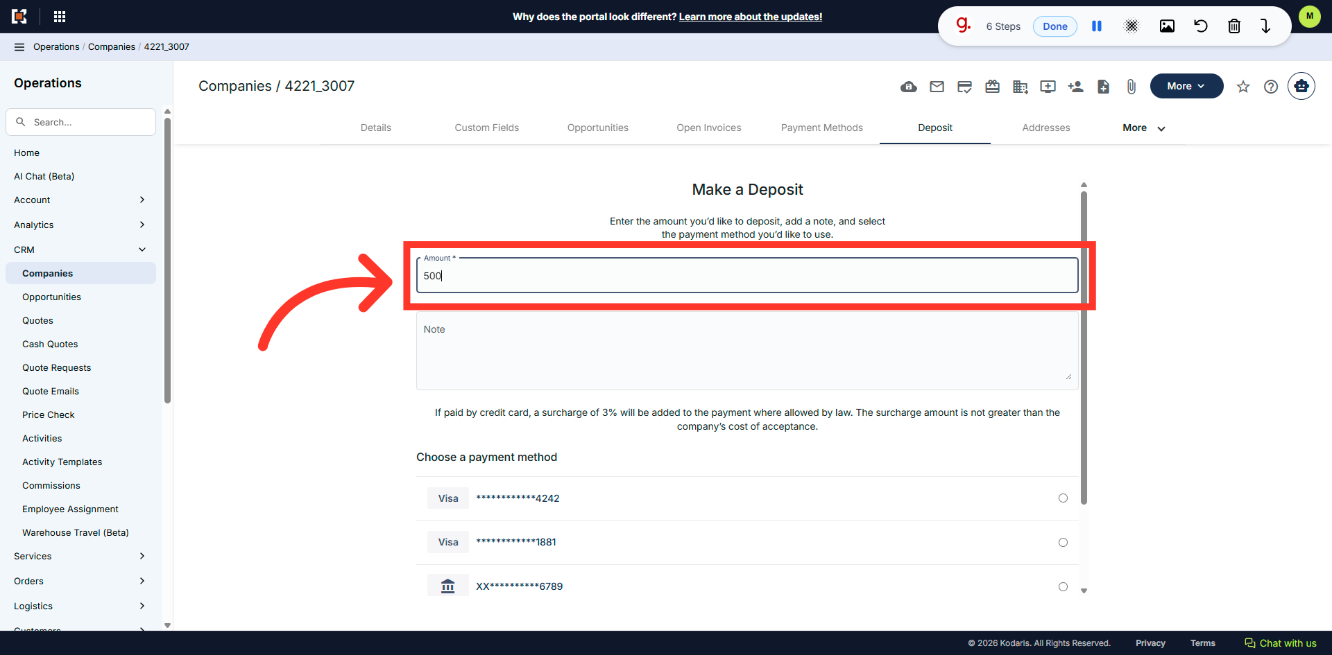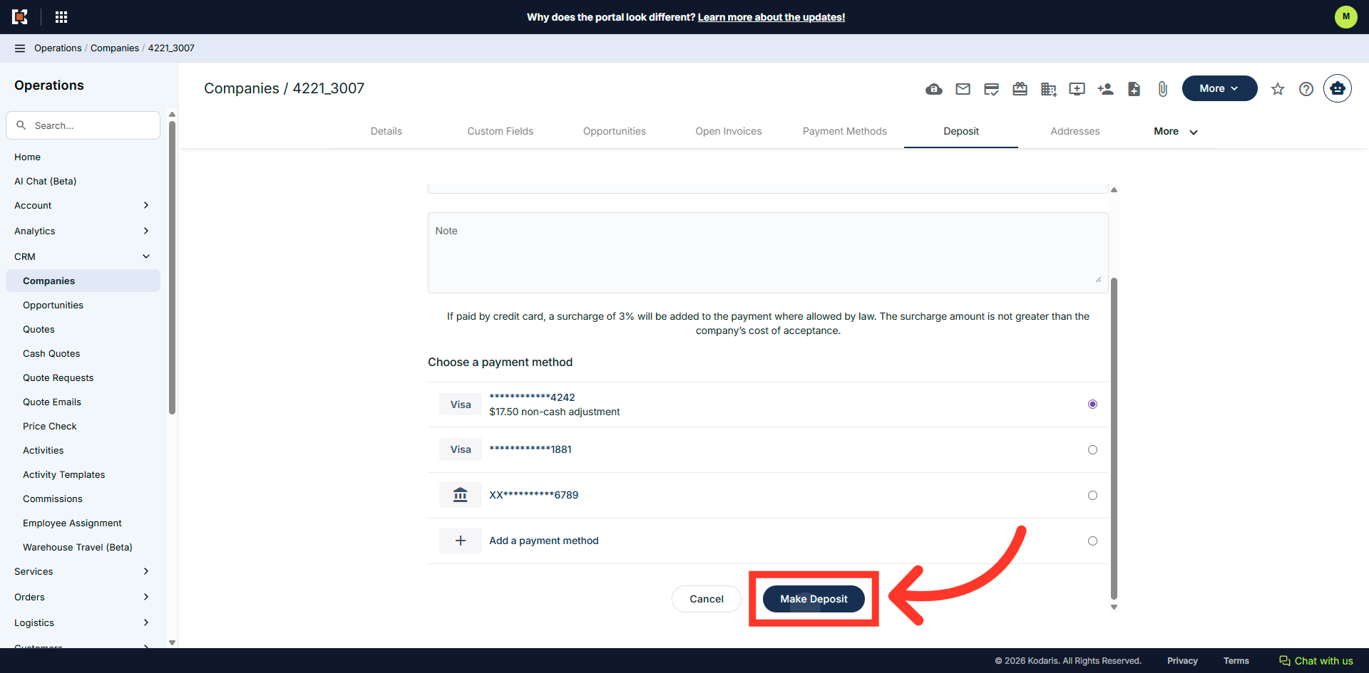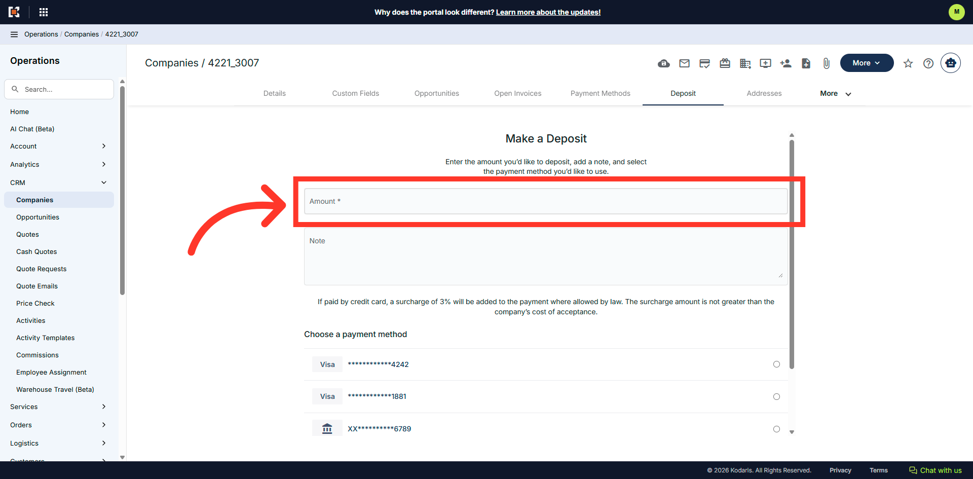 To initiate a deposit under a company, navigate to the "CRM" section in the Operations Portal.
