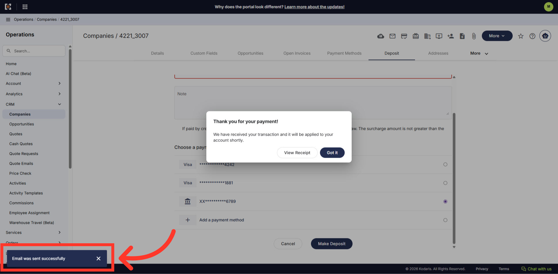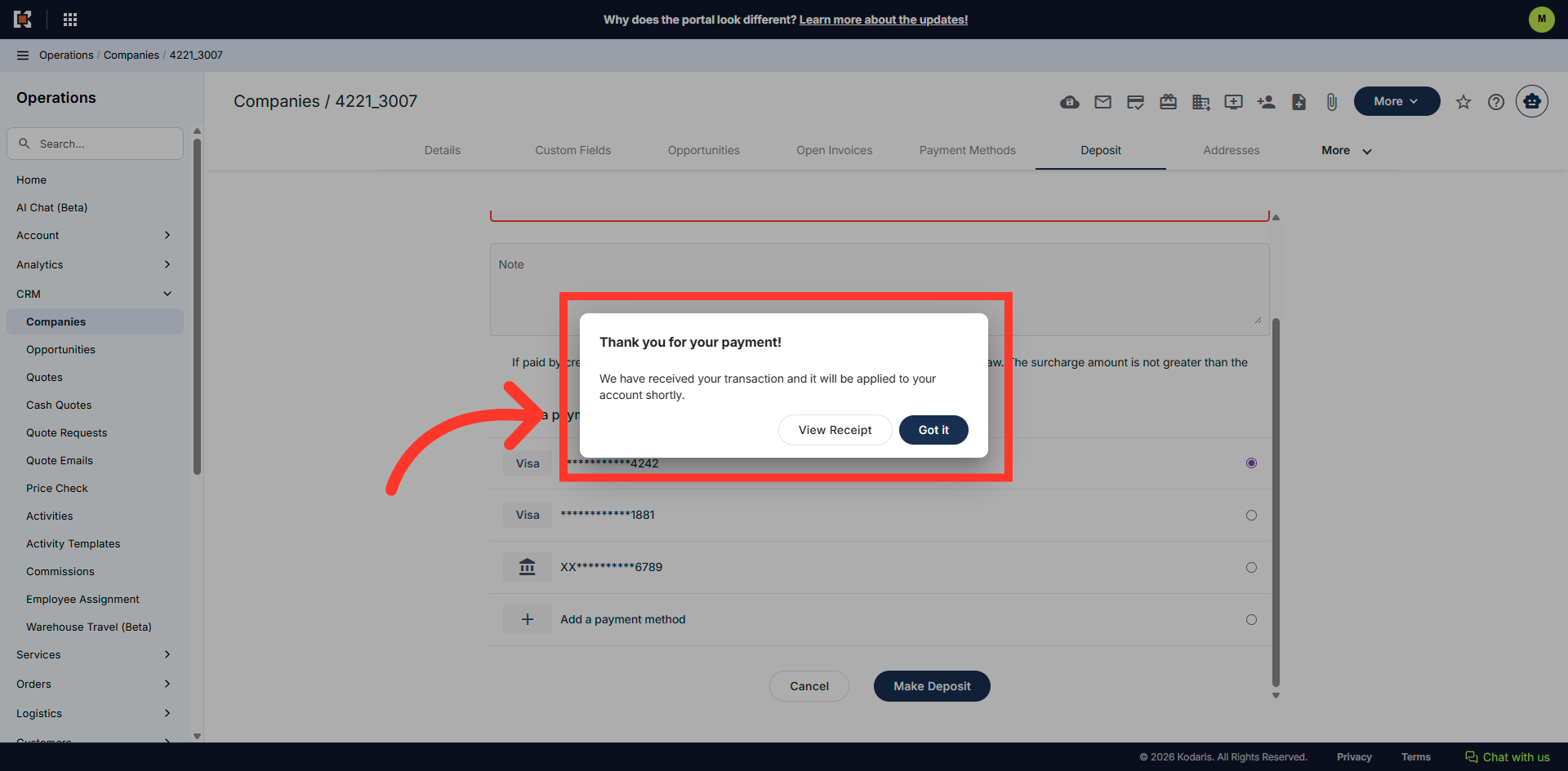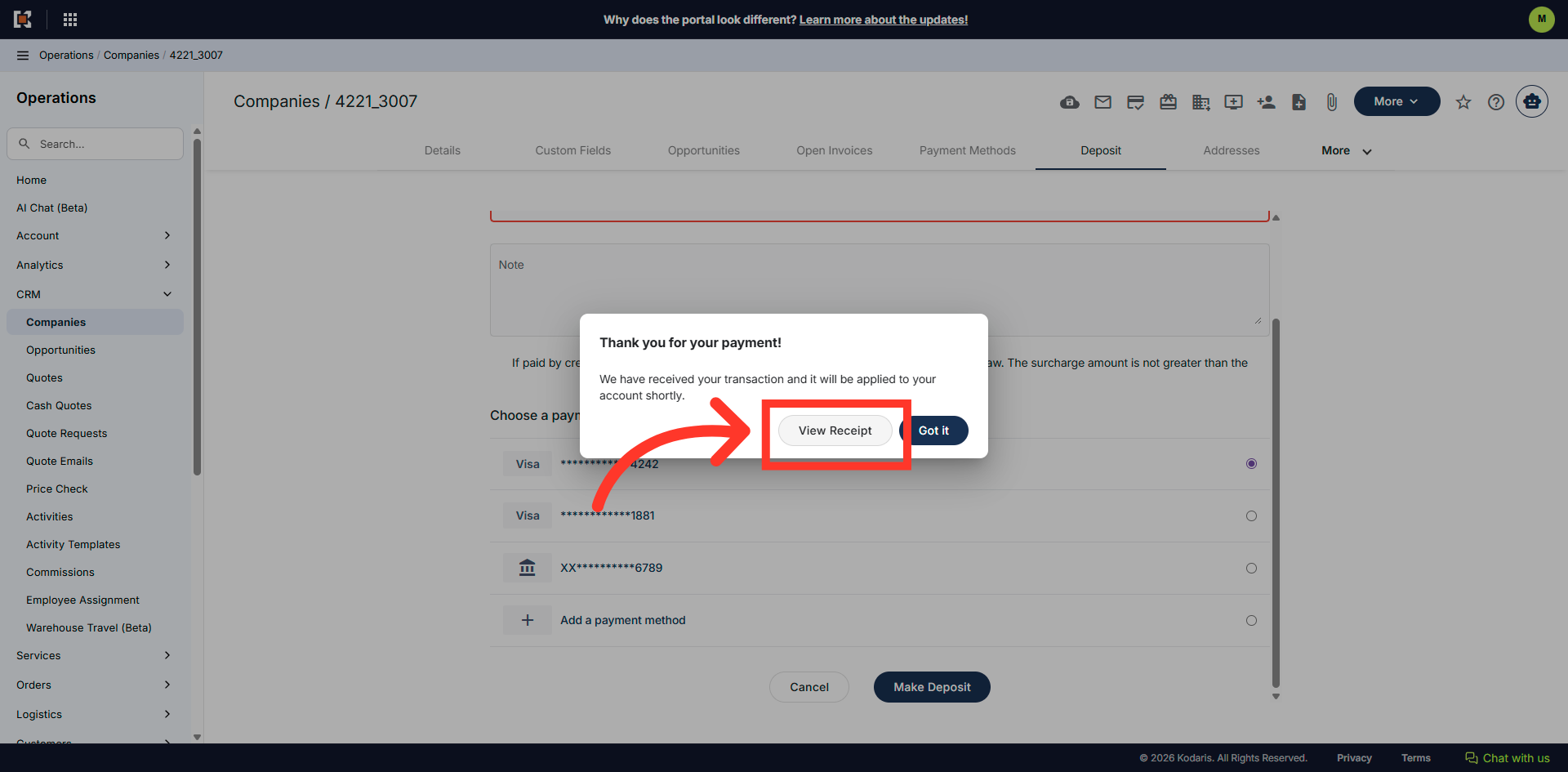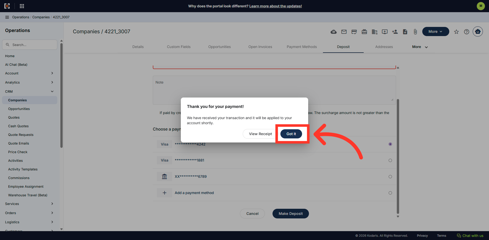 To initiate a deposit under a company, navigate to the "CRM" section in the Operations Portal.