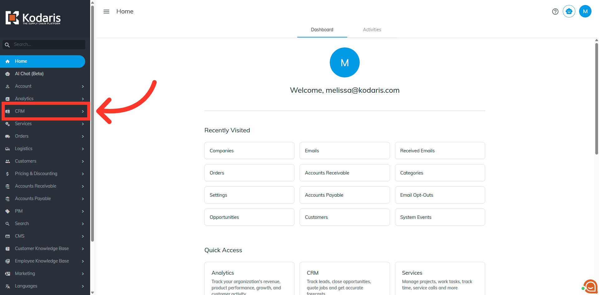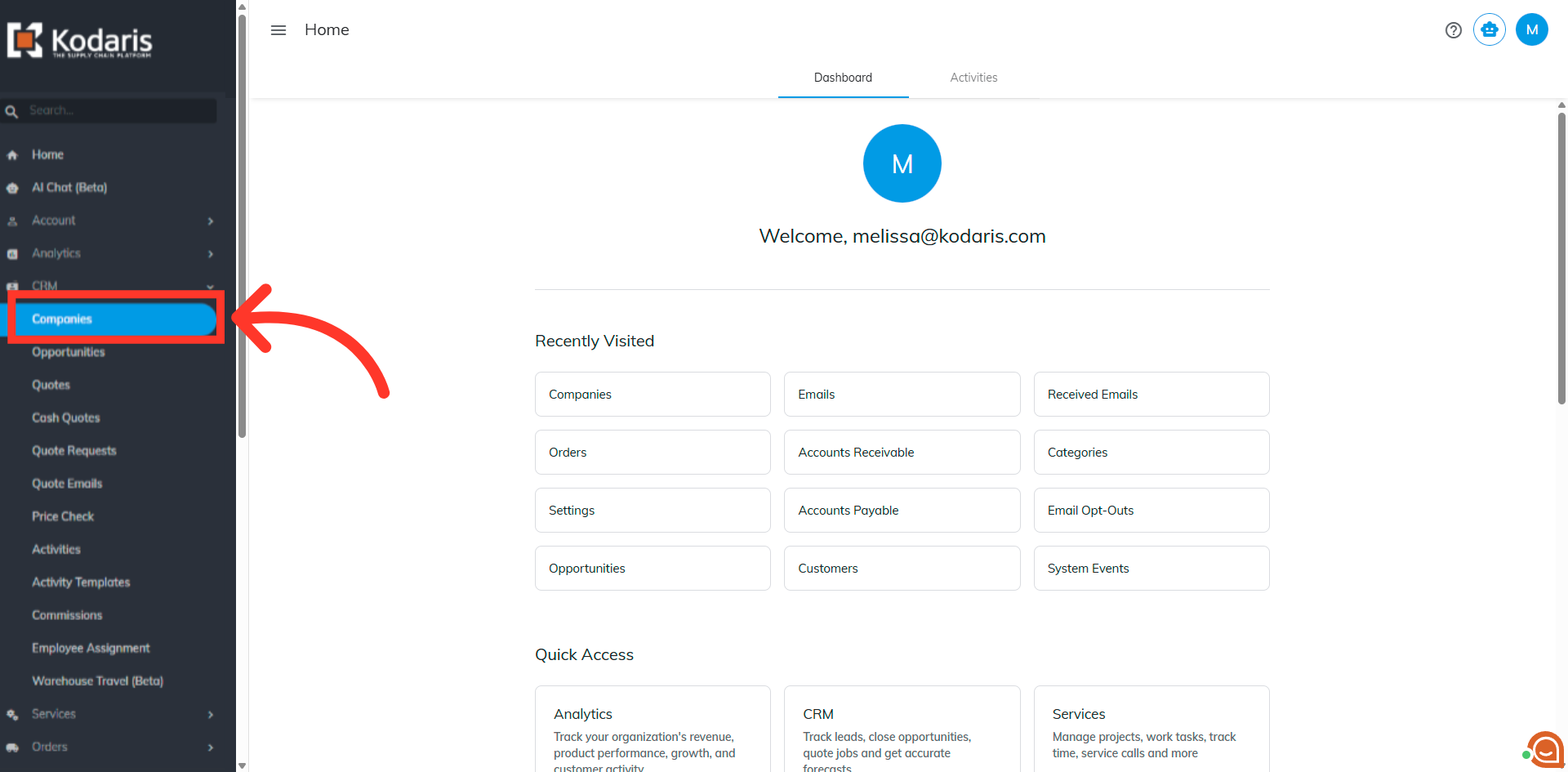 Then, click "Companies". In order to access "Companies" you will need to be set up either as an "administrator" or a "superuser", or have the appropriate roles: "companyView and companyEdit", or "crmCompanyView and crmCompanyEdit". Just a reminder, "crmCompanyView and crmCompanyEdit" access only allows employees to view companies that are assigned to them. You will also need to be set up with the additional "accountant" permission in order to issue a charge