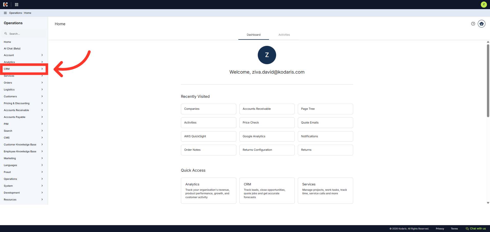 You can view, edit or delete vaulted payment methods from your customer account, in the Operations Portal. First navigate to the "CRM" section.