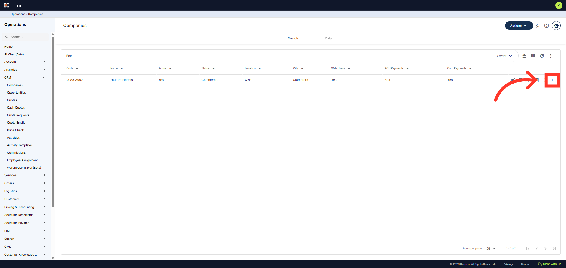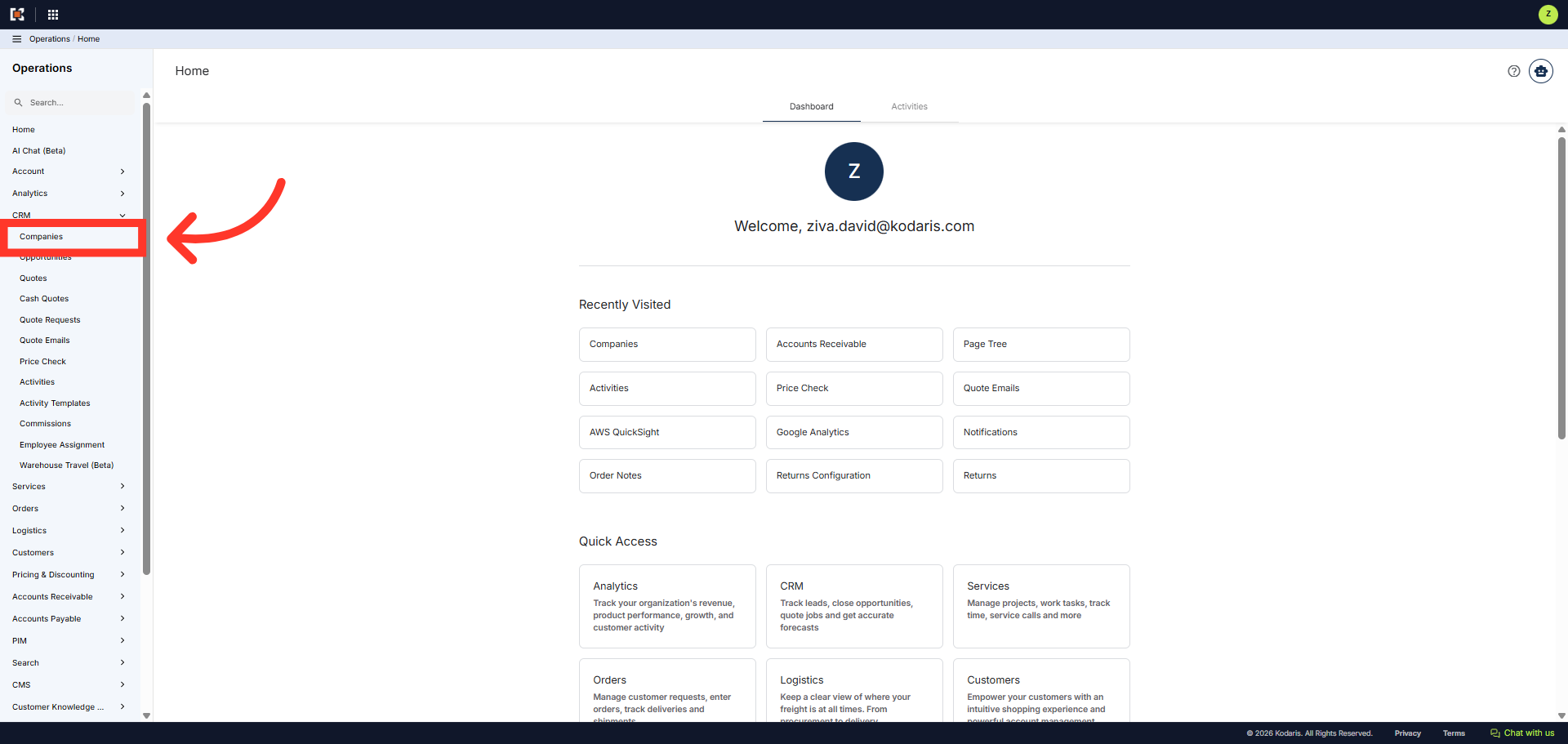Then, click "Companies". In order to access "Companies" you will need to be set up either as an "administrator" or a "superuser", or have the appropriate roles: "companyView and companyEdit", or "crmCompanyView and crmCompanyEdit". Just a reminder, "crmCompanyView and crmCompanyEdit" access only allows employees to view companies that are assigned to them.