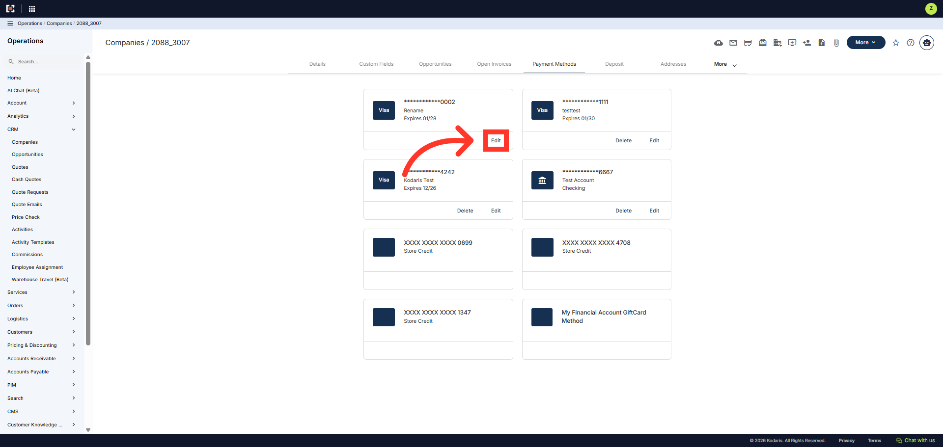 In the "Payment Methods" screen, you can edit or delete customer payment methods. Click the "Edit" option to modify details of an existing payment method.