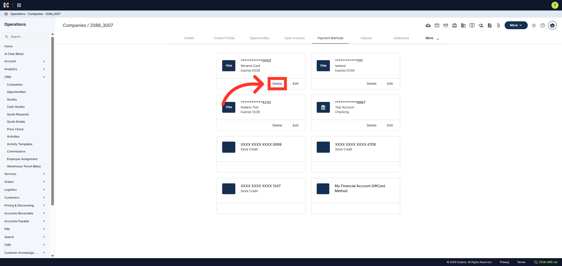 In the "Payment Methods" screen, you can also remove a customer payment method. Click "Delete" to remove a payment method that is no longer needed or valid. Note: Once you click the delete button, the removal is instant.