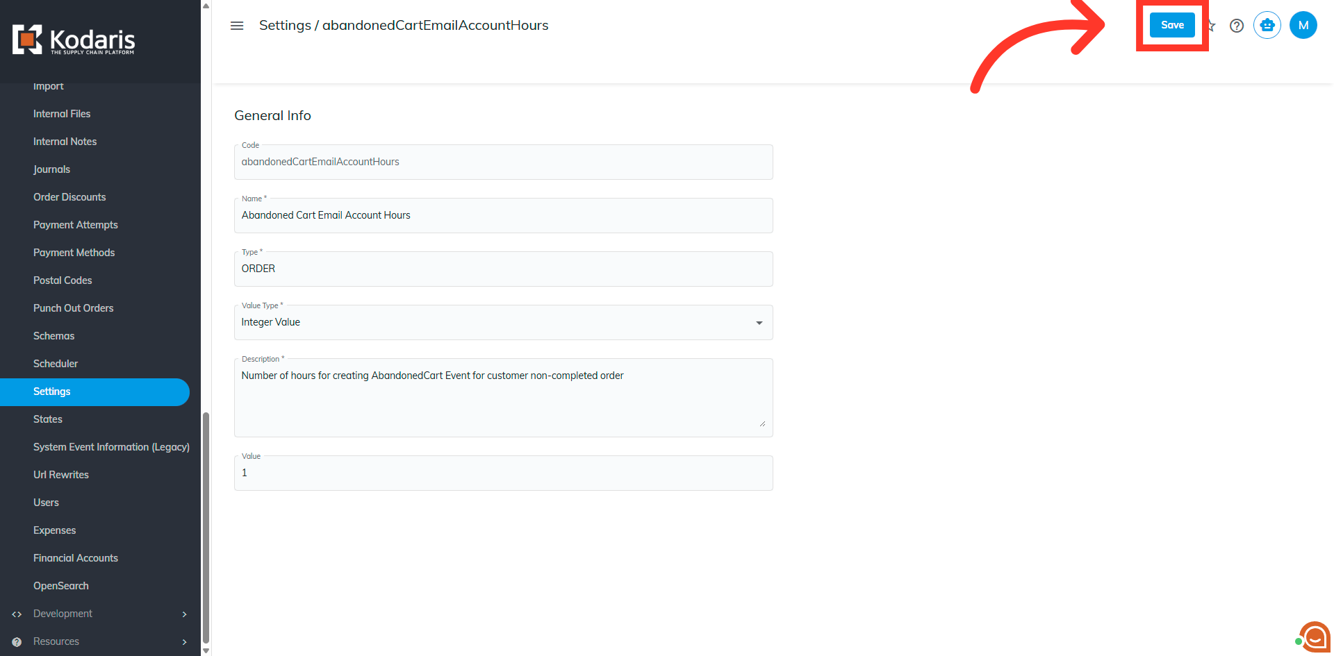 Search for the setting "abandonedCartEmailGuestHours". This setting allows you to set the number of hours before an abandoned cart reminder is sent to guest users.