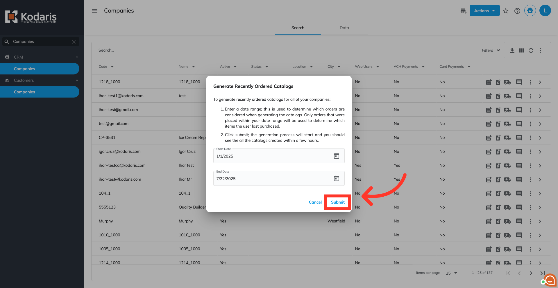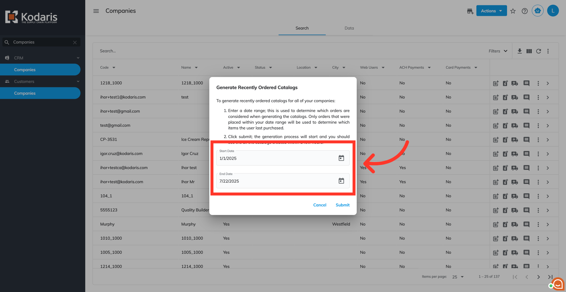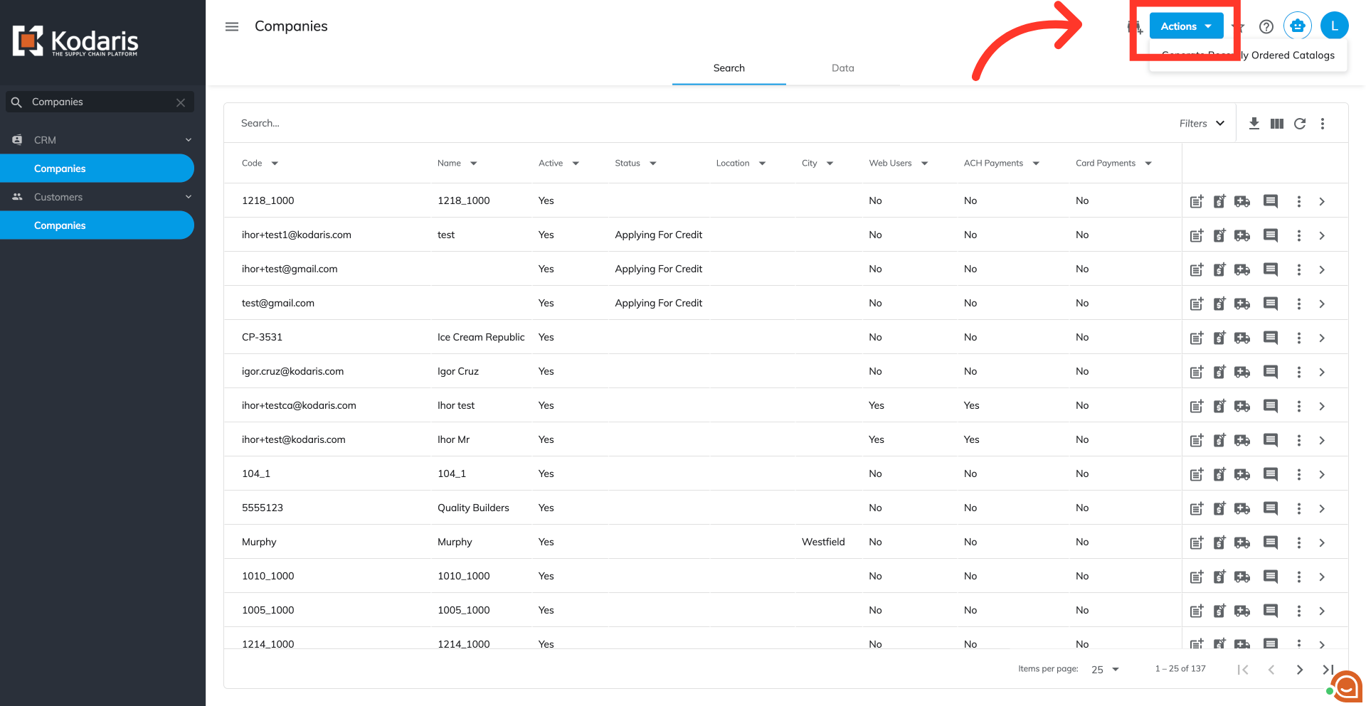 If the "Recently Ordered" catalog hasn't been initialized before, you must manually generate it. This involves specifying a historical date range for order data to populate the catalog with past purchases. This is a one-time process to set up the catalog before automatic generation takes over. In your operations portal, navigate to the "Companies" screen within the "Customers" or "CRM" section. In order to access "Companies" you will need to be set up either as an "administrator" or a "superuser", or have the appropriate roles: "companyView," "crmCompanyView," "companyEdit," "crmCompanyEdit," and "dispatch"