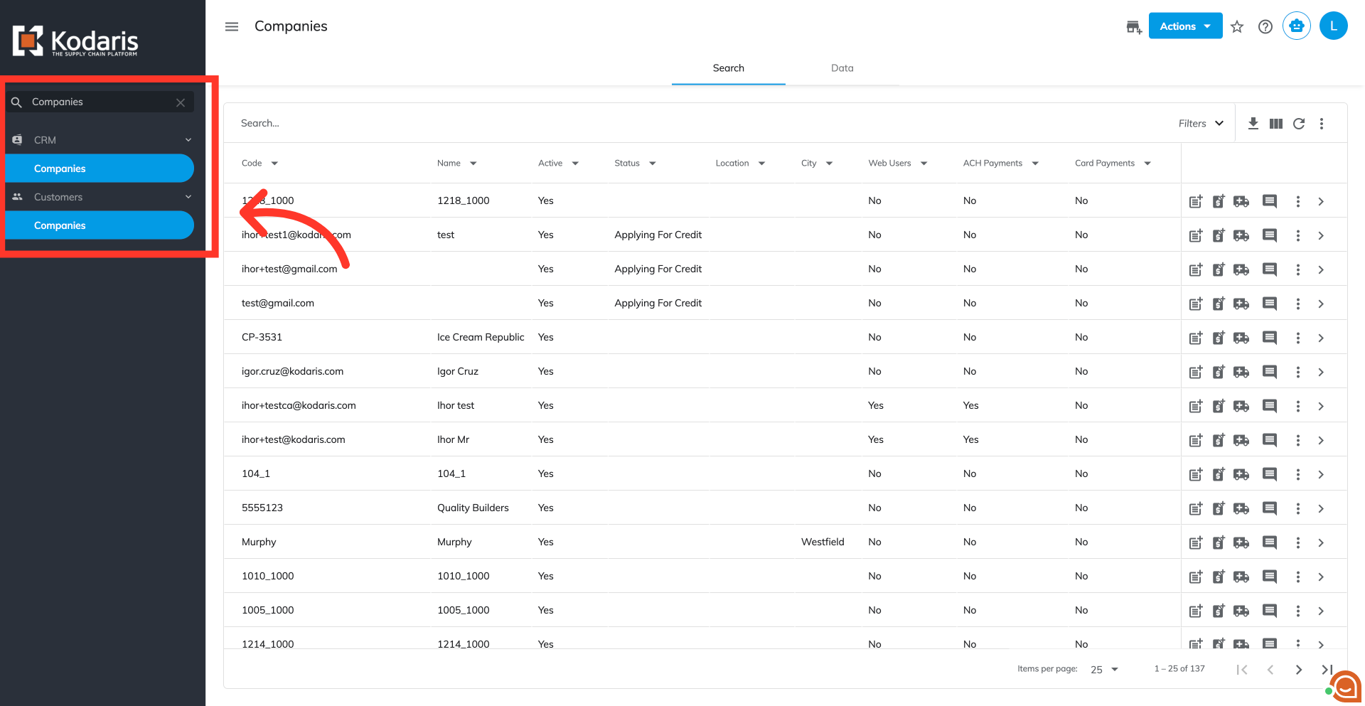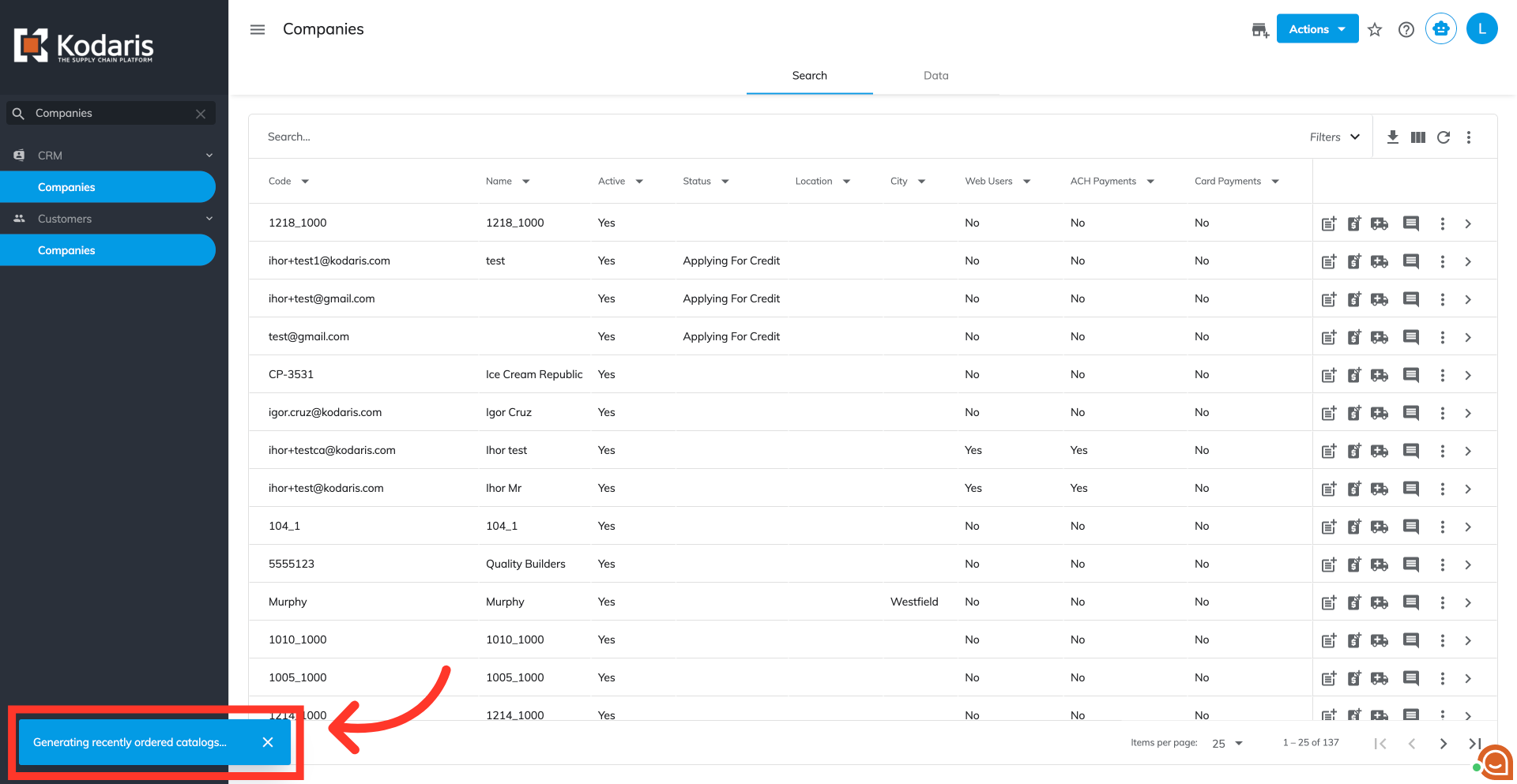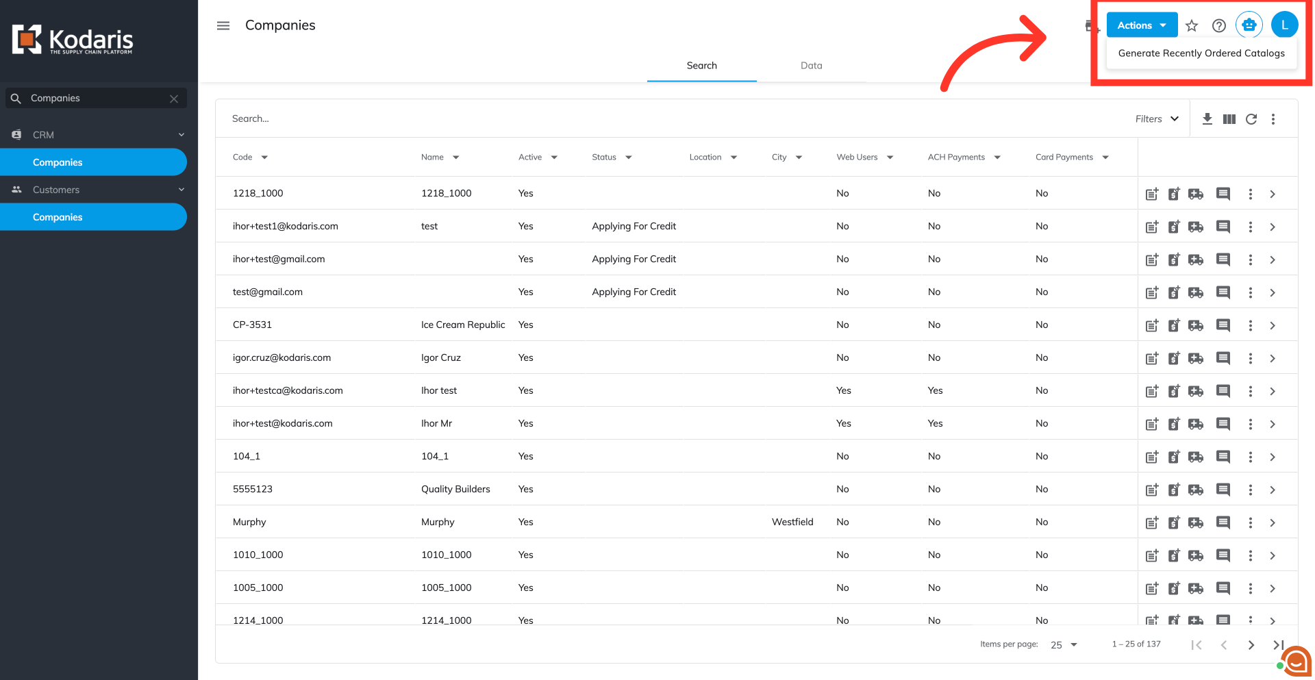 If the "Recently Ordered" catalog hasn't been initialized before, you must manually generate it. This involves specifying a historical date range for order data to populate the catalog with past purchases. This is a one-time process to set up the catalog before automatic generation takes over. In your operations portal, navigate to the "Companies" screen within the "Customers" or "CRM" section. In order to access "Companies" you will need to be set up either as an "administrator" or a "superuser", or have the appropriate roles: "companyView," "crmCompanyView," "companyEdit," "crmCompanyEdit," and "dispatch"