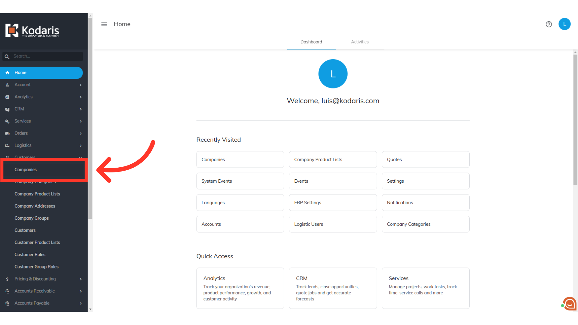 Then, click "Companies". In order to access "Companies" you will need to be set up either as an "administrator" or a "superuser", or have the appropriate roles: "companyView, companyEdit" , customerView, and customerEdit along with "importEdit" and "importView". These last two roles are needed for importing.