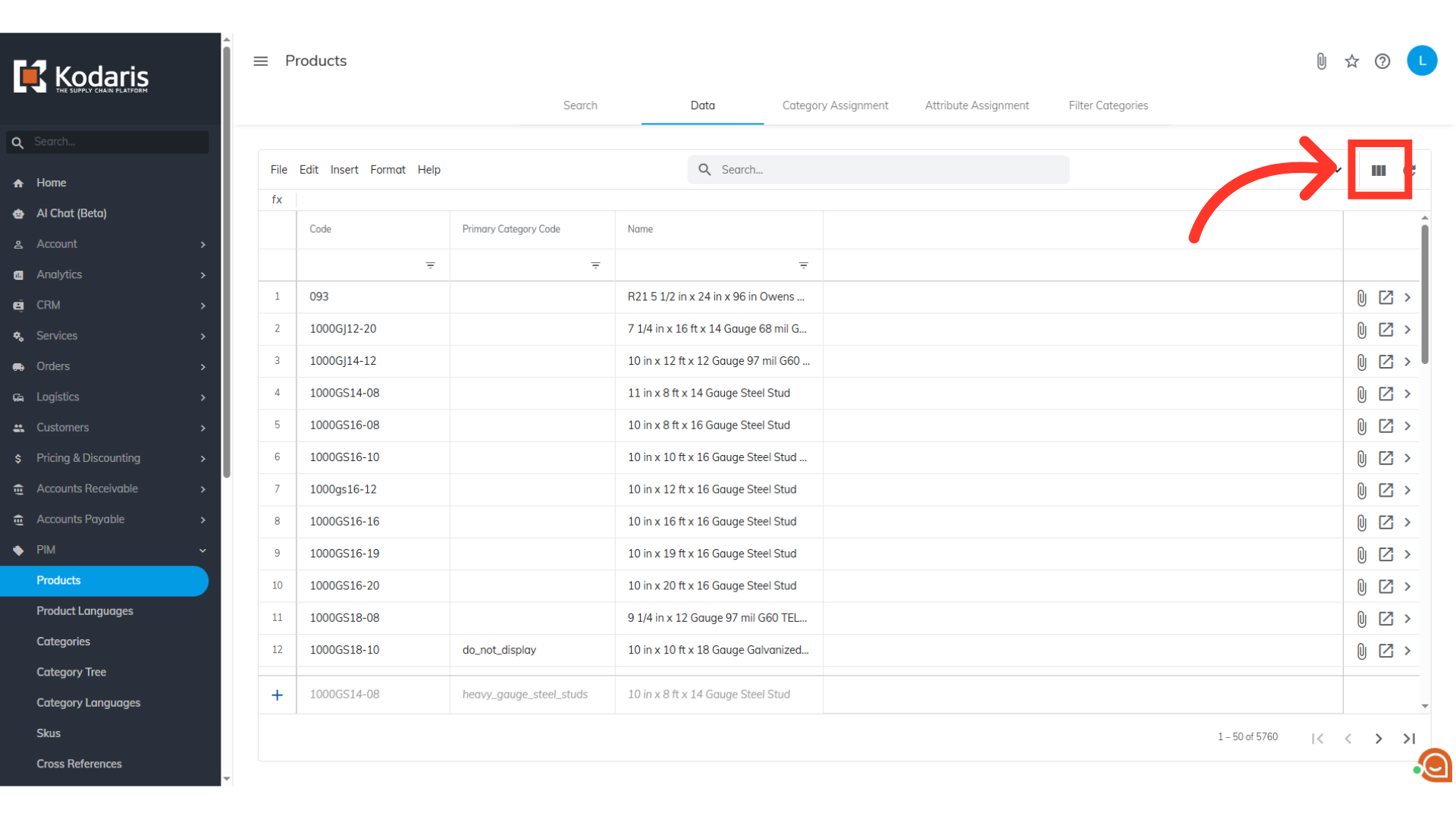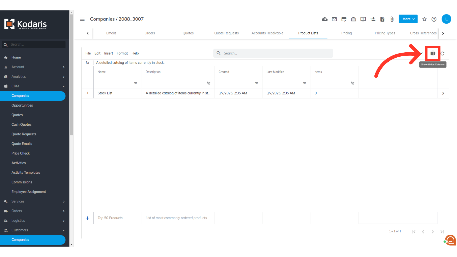 Now that you have a product list, you need to know the product list code as it will be needed for the import. Click the "Show/Hide Columns" icon.