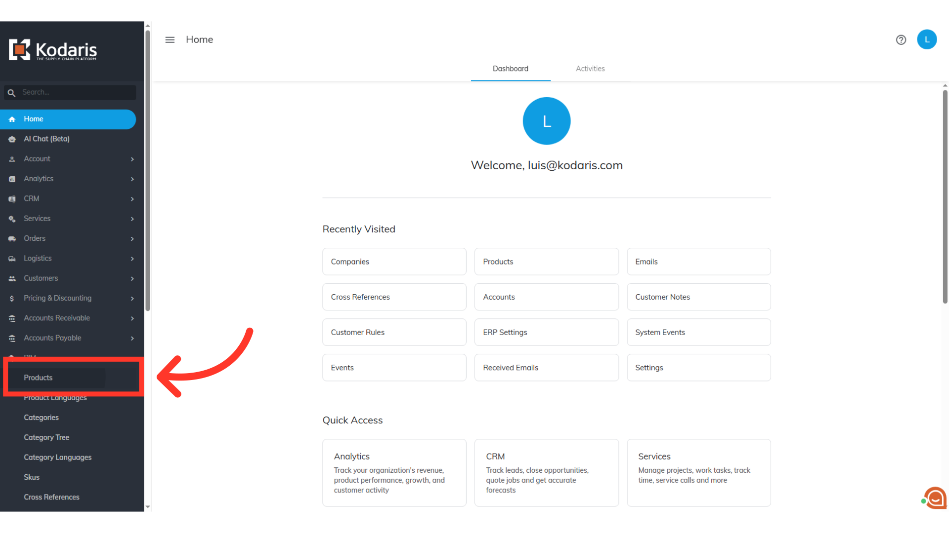 Then, click on Products. In order to access and update “Products” you will need to be set up either as an “administrator” or a “superuser”, or have the roles of: “productView” and “productEdit”.