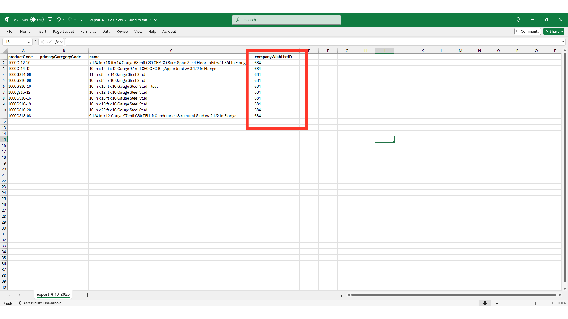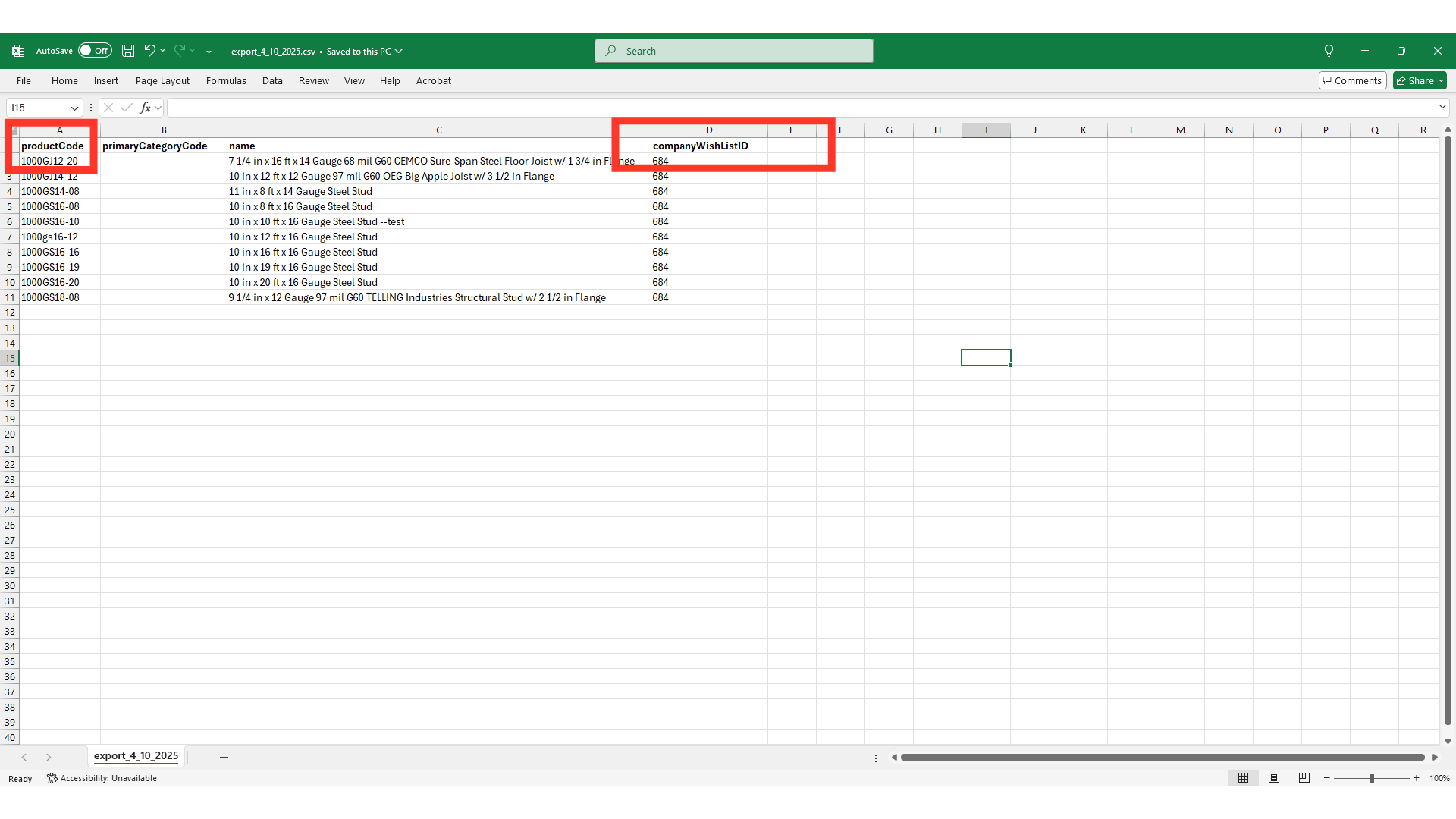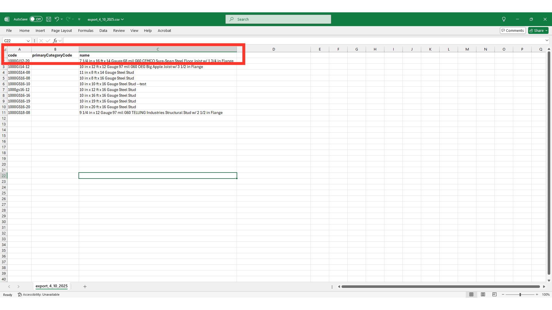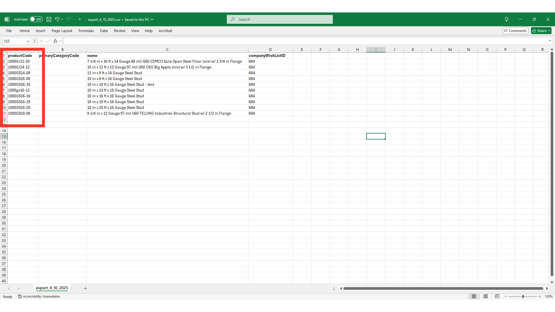 Here's what a sample of the exported file looks like, which contains the product codes we would like to add to the product list.