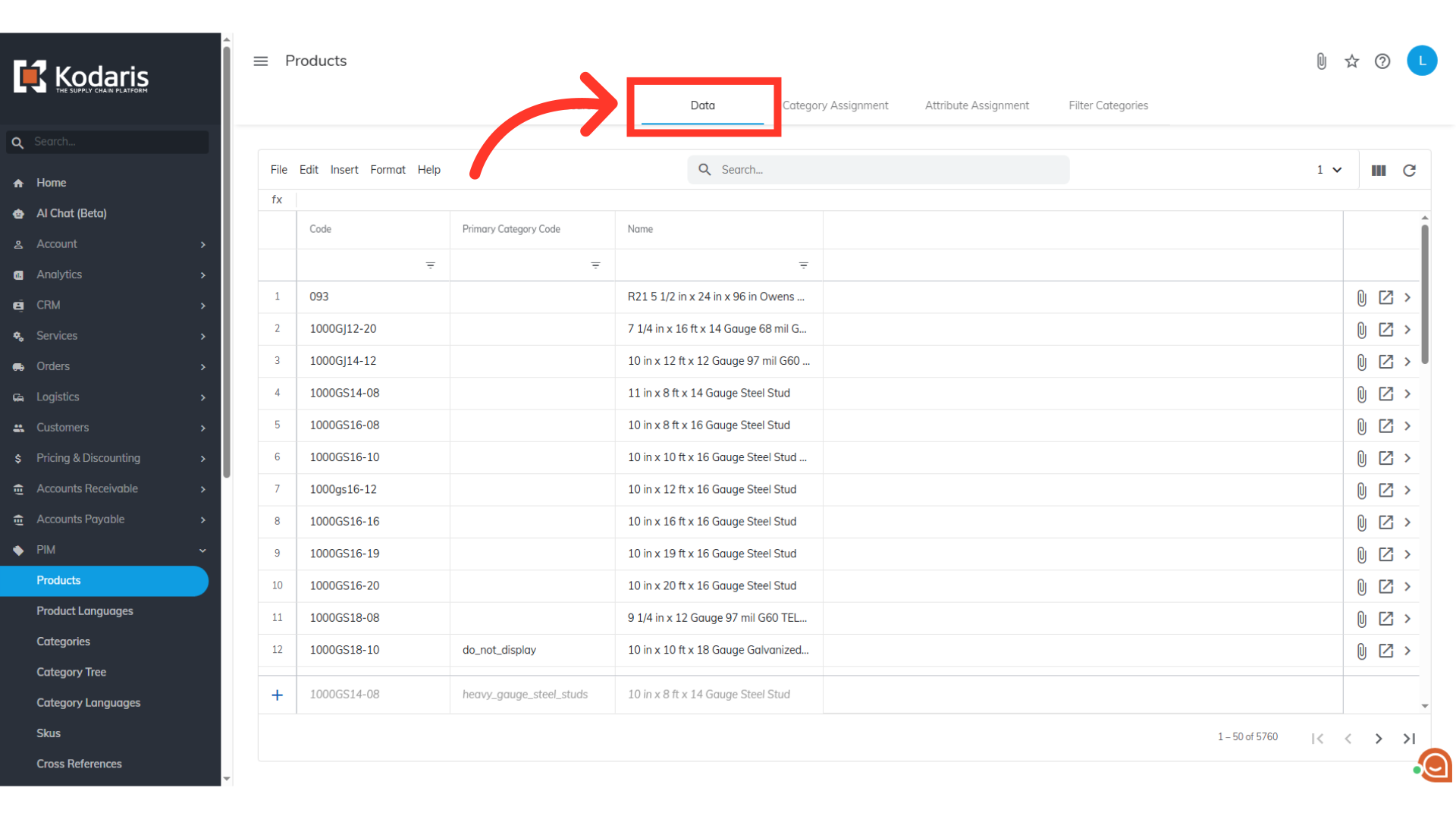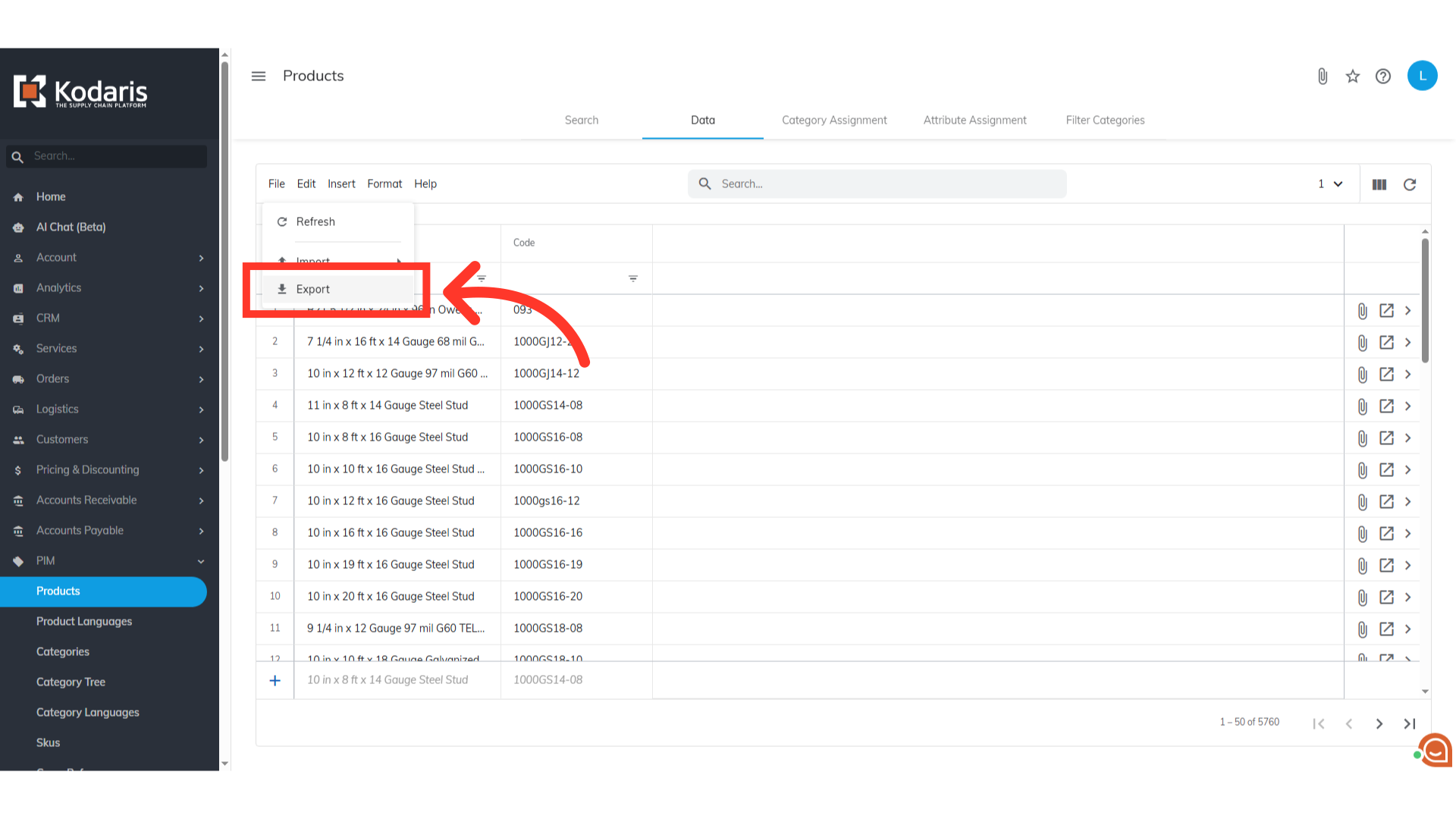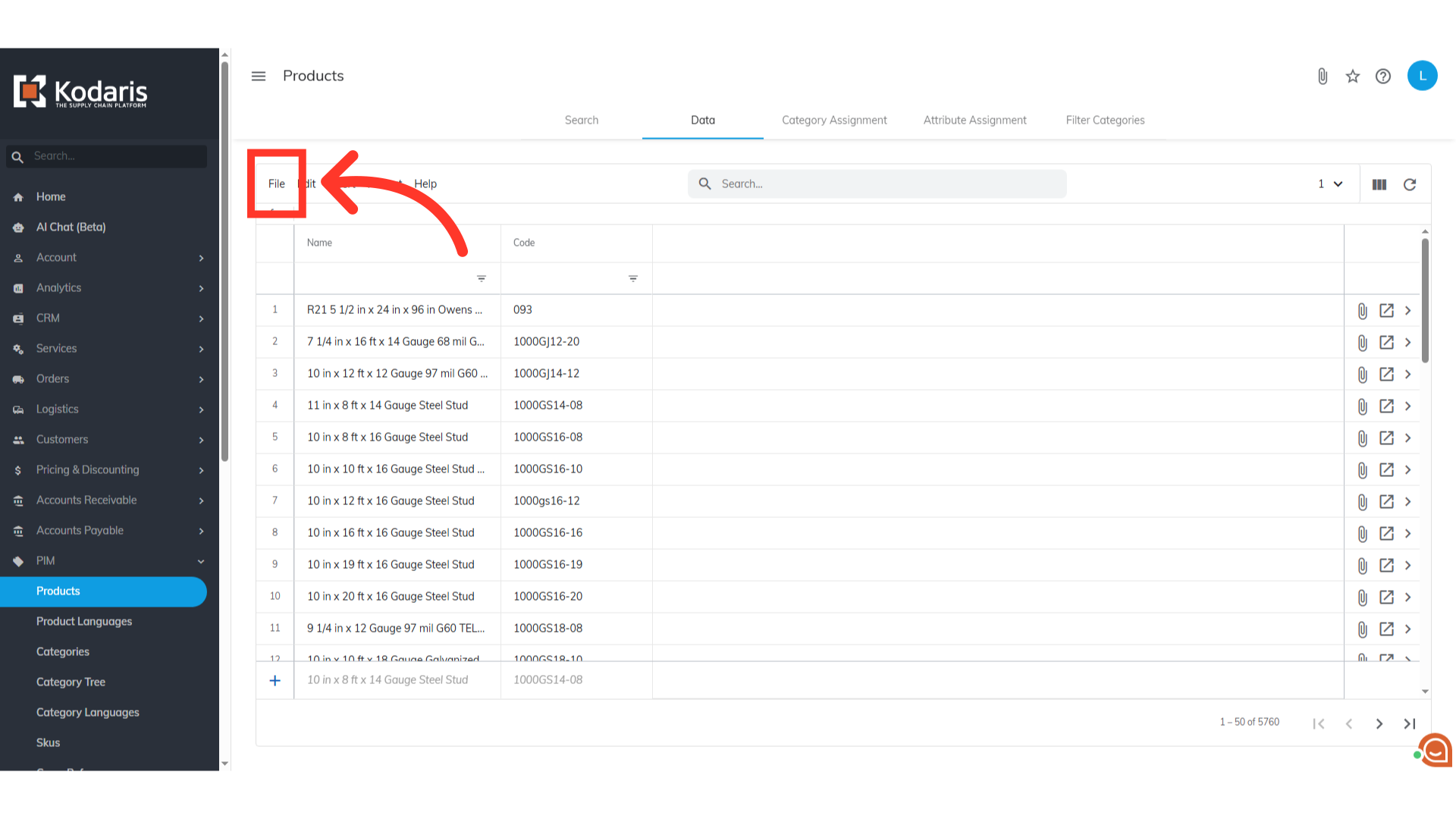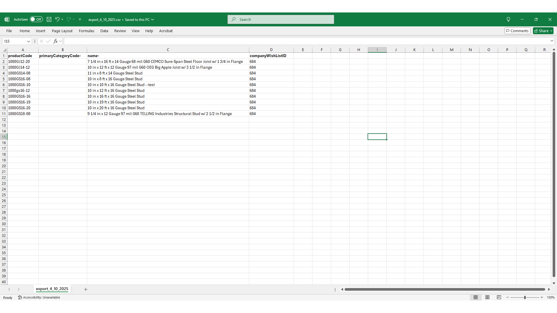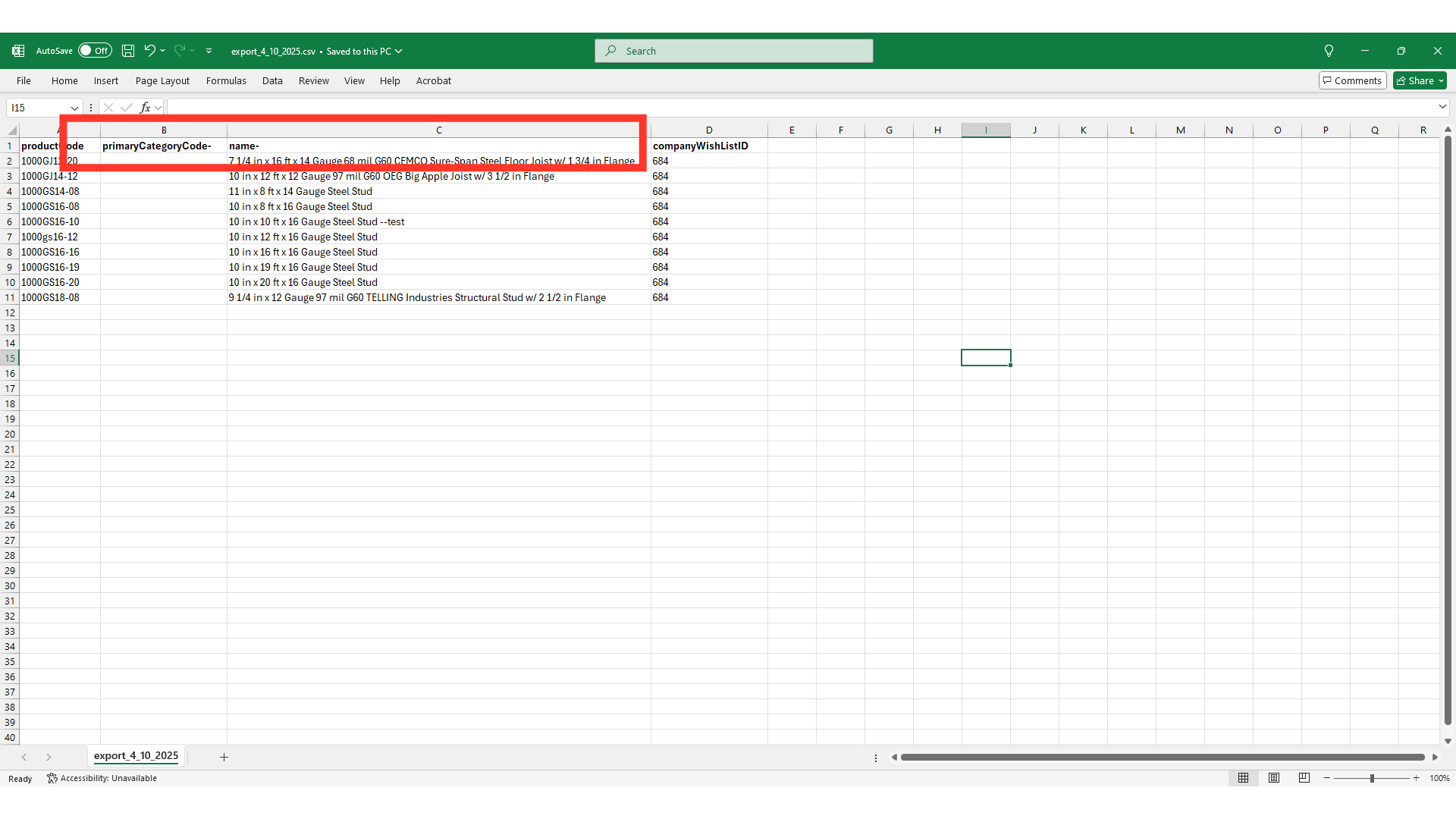 Here's what a sample of the exported file looks like, which contains the product codes we would like to add to the product list.