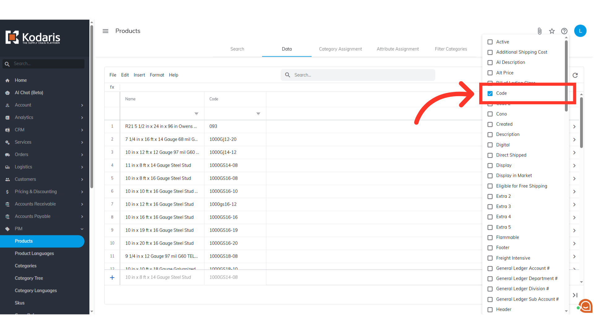 If you would like to use this export for you import, you will need to select the "Code" column. You can choose to add other columns if you would like, but for now, only the "Code" column is required. We have also selected the "Name" column as it contains helpful information.