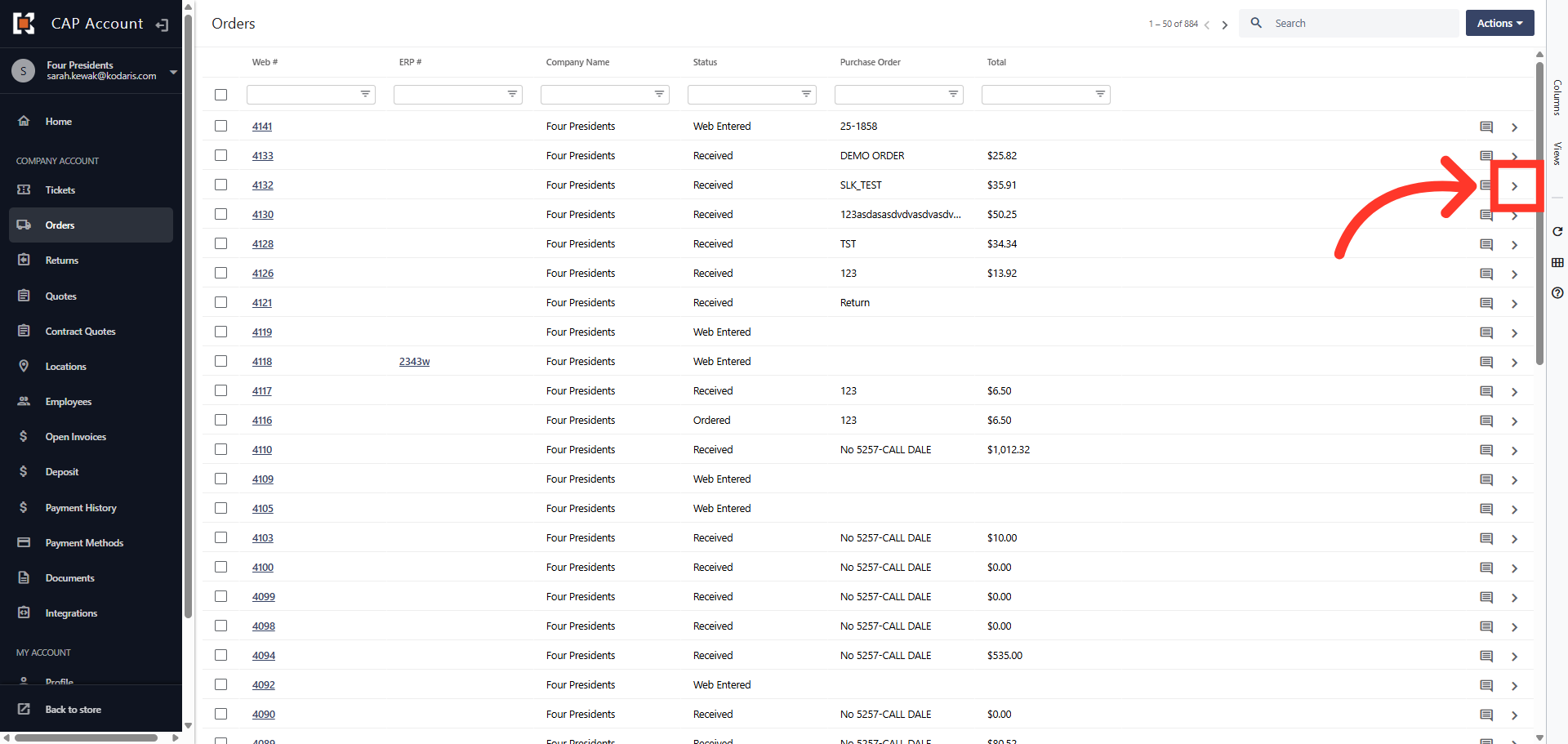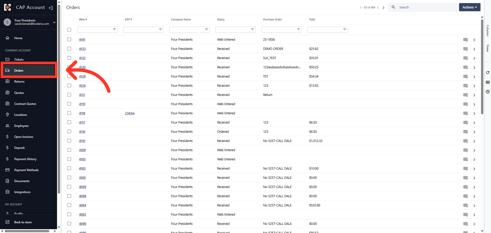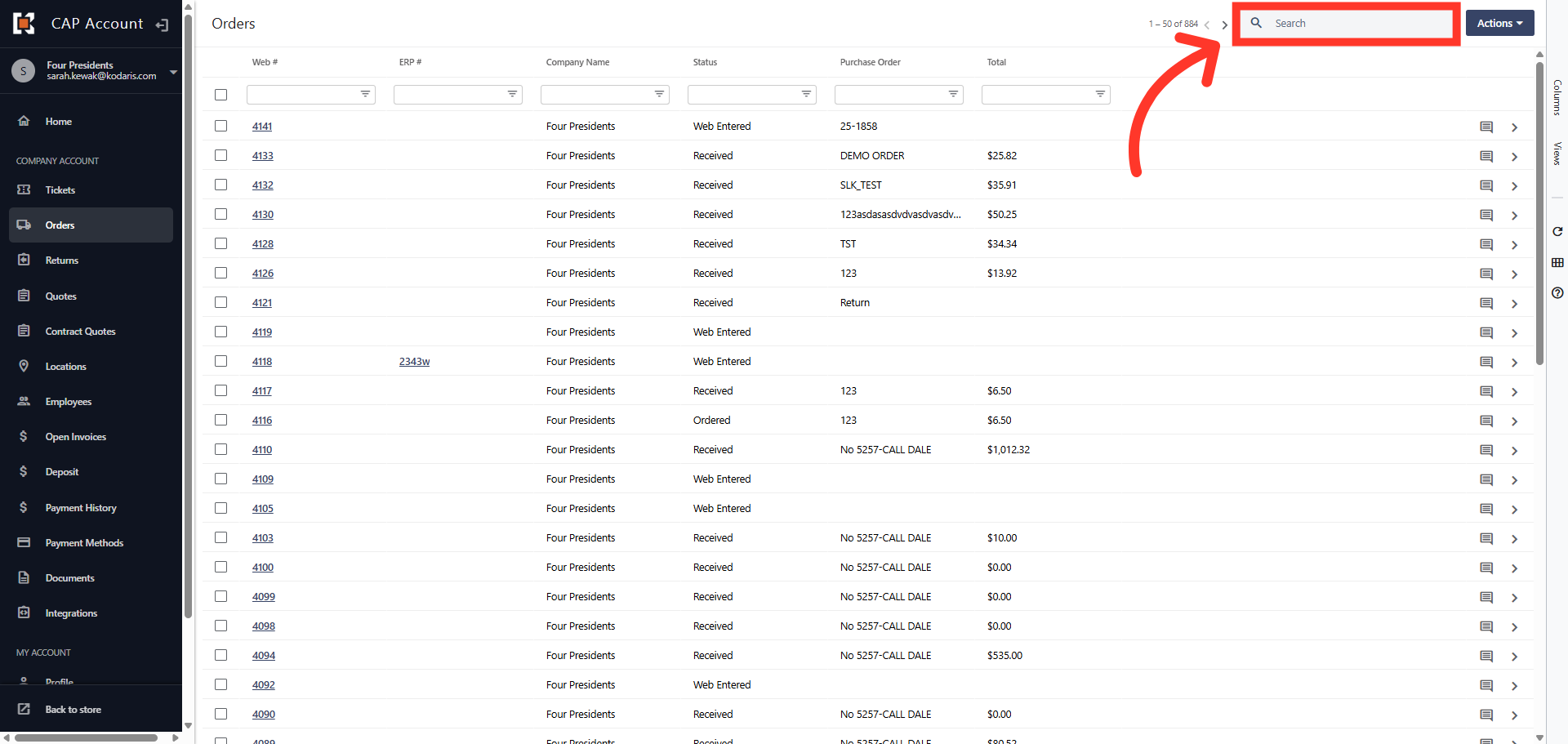 In order to access "Orders", you will need to have the role of "Company Admin", "View All Orders", or "View Assigned Location Orders". Search for the order in the "Search" field.
