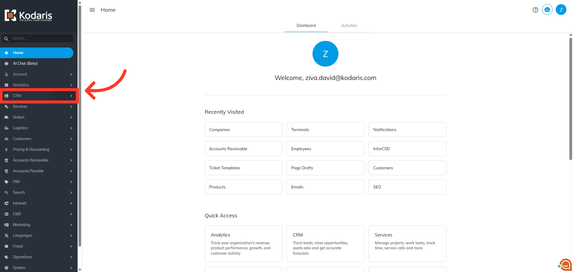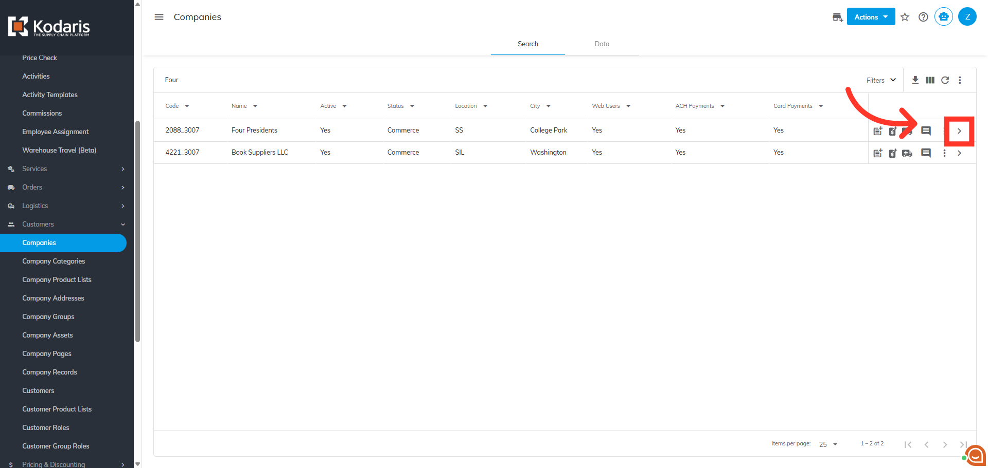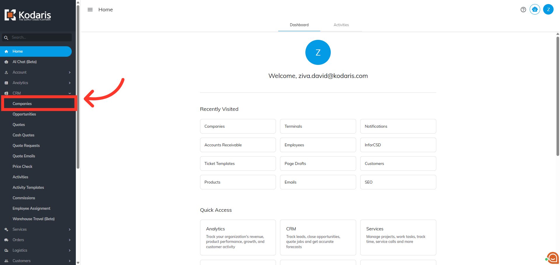 Then, click on "Companies". In order to access "Companies" you will need to be set up either as an "administrator" or a "superuser", or have the appropriate roles: "companyView", "companyEdit" , "customerView", and "customerEdit".
