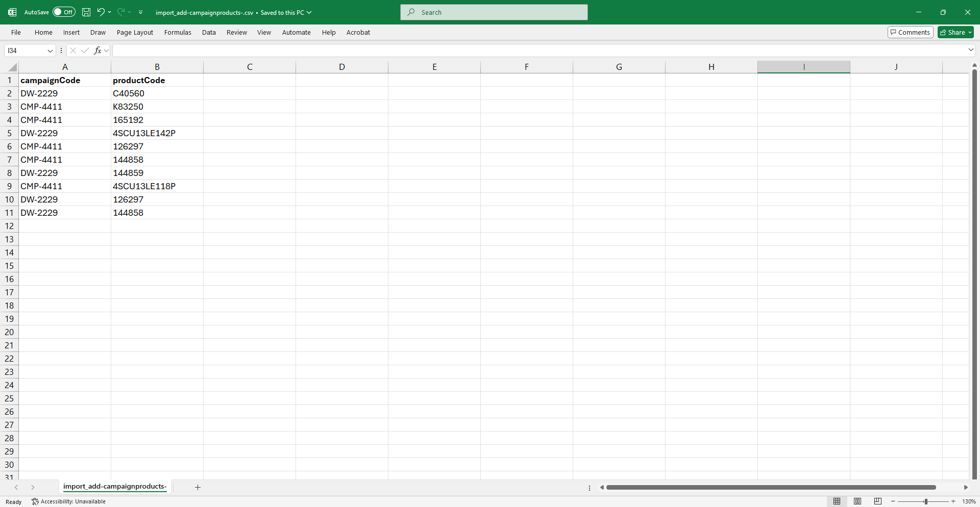 To add products to an existing campaign by import, you will first need to prepare your .CSV import file which should contain the campaign code and the product codes that you would like to add. Using the Import feature, you can quickly manage which products are tied to your campaigns. Create a spreadsheet with a column for each "campaignCode" and "productCode".