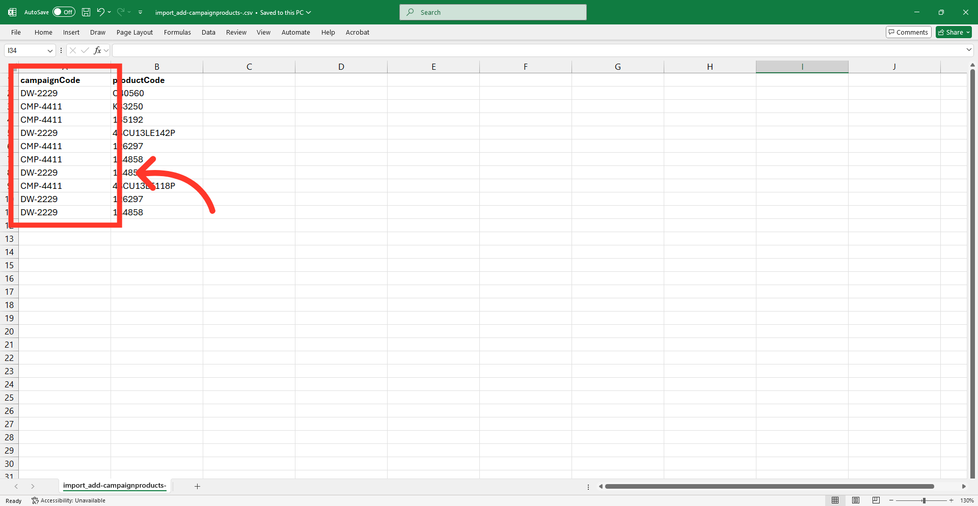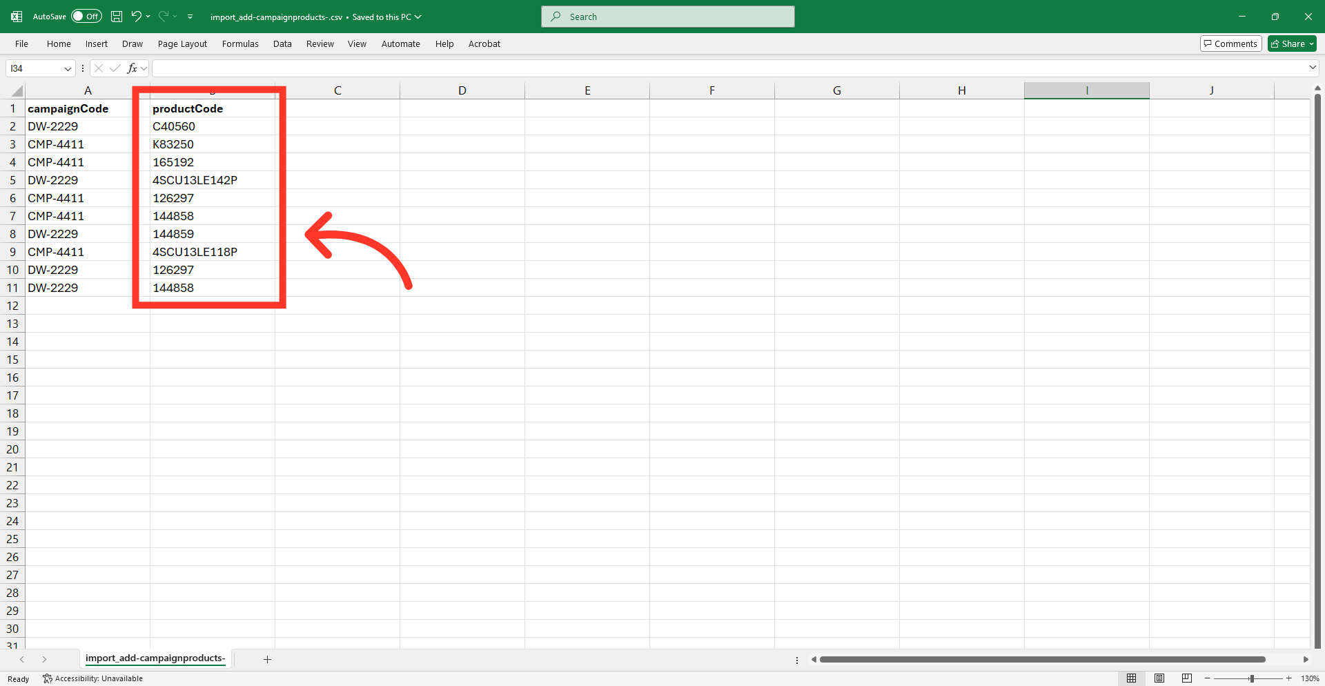 Populate the "productCode" column with the product codes of the items you want to add to the campaign. Once you have made all the necessary changes, save your spreadsheet as a .CSV file, making sure it only contains the data you want to update.