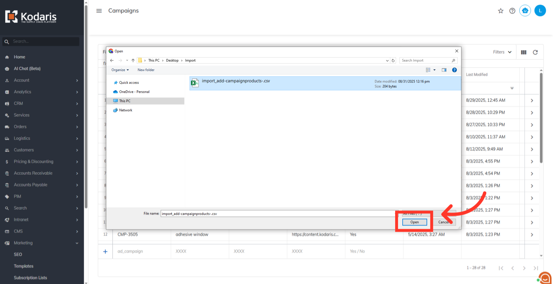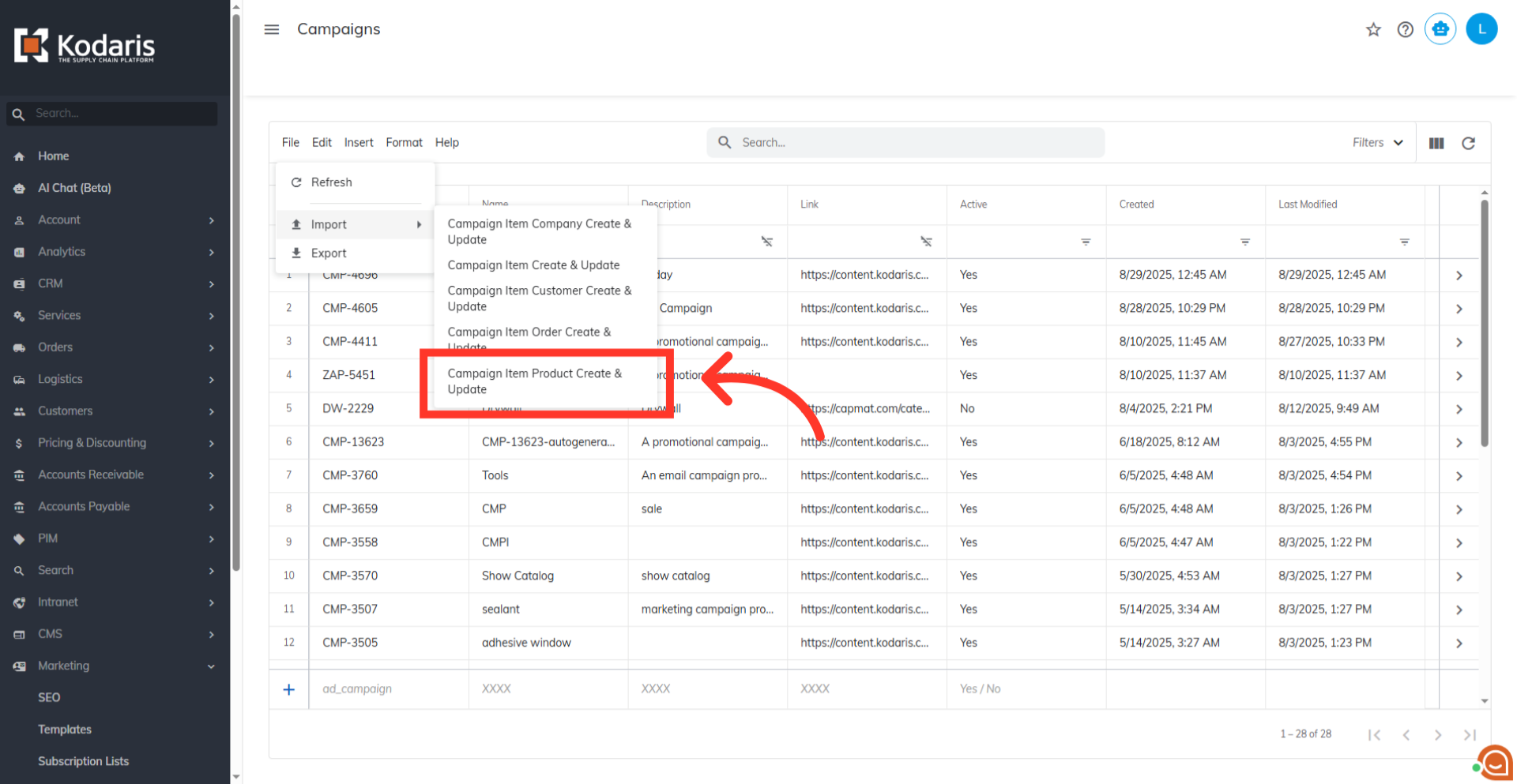 Now you're ready to import your data. Go back to your "Campaigns" screen. From the "File" dropdown menu, select "Import", then choose "Campaign Item Product Create & Update". (NEED PERMISSIONS)