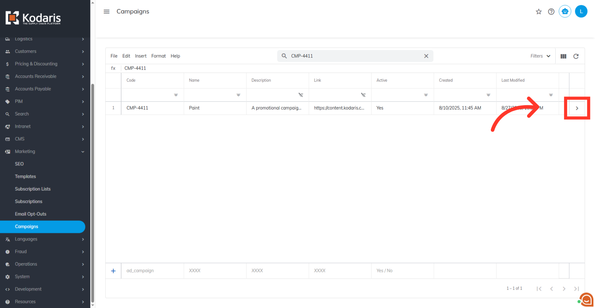Log in to the Operations Portal and navigate to the "Campaigns" screen within the "Marketing" section. To view or update campaigns, users must be an "administrator" or "superuser," or have both "campaignView" and "campaignEdit" roles. Find a campaign and copy its unique code. If not visible on screen, use the "Show/Hide columns" feature to show the "code" column.