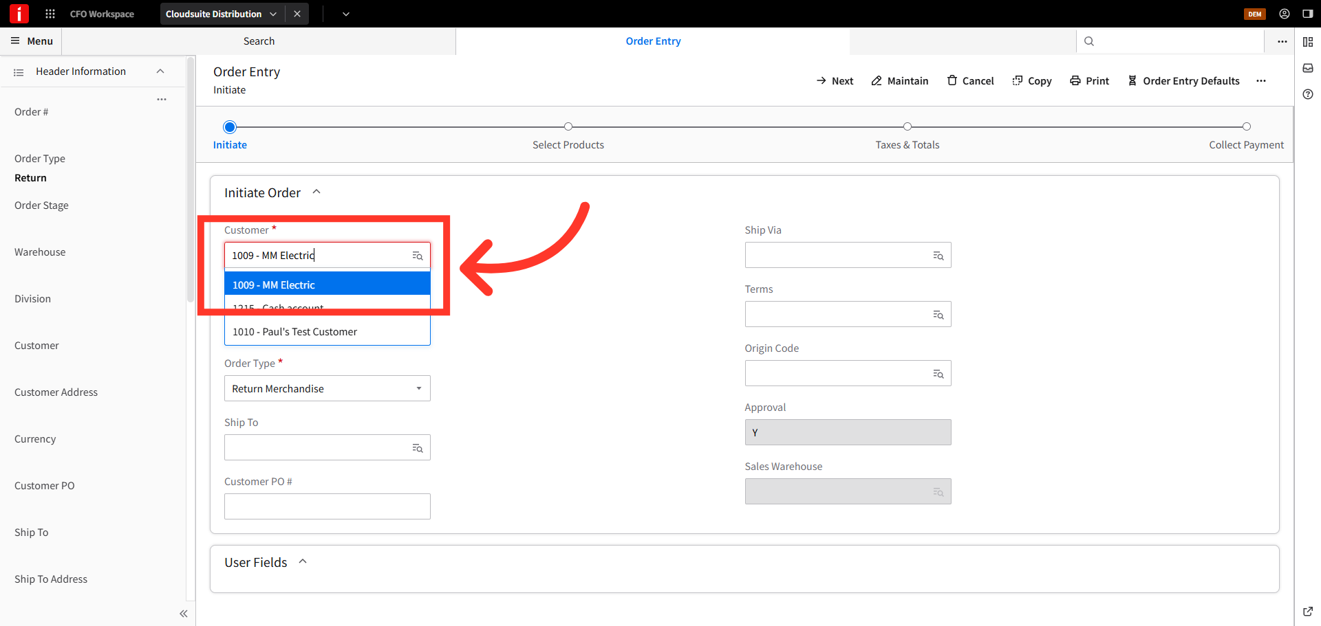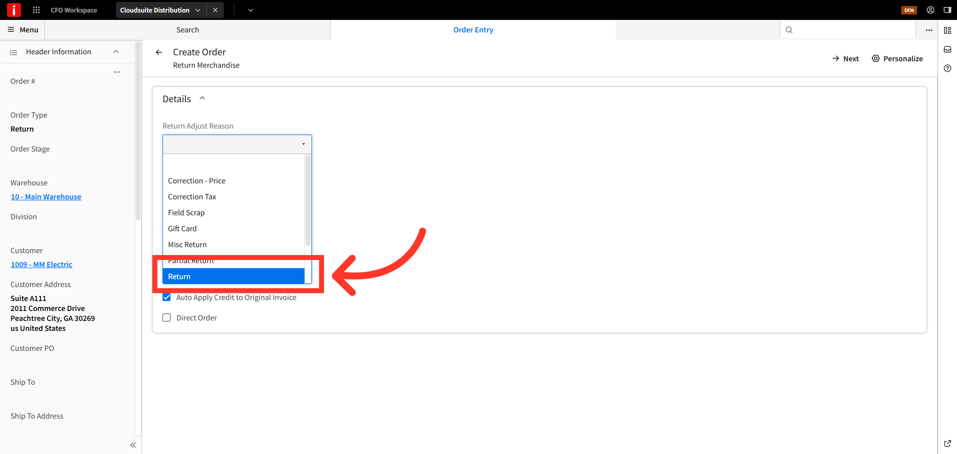 Then, in the "Order Type" field, choose the "Return Merchandise" option to initiate the return process for a customer order.
