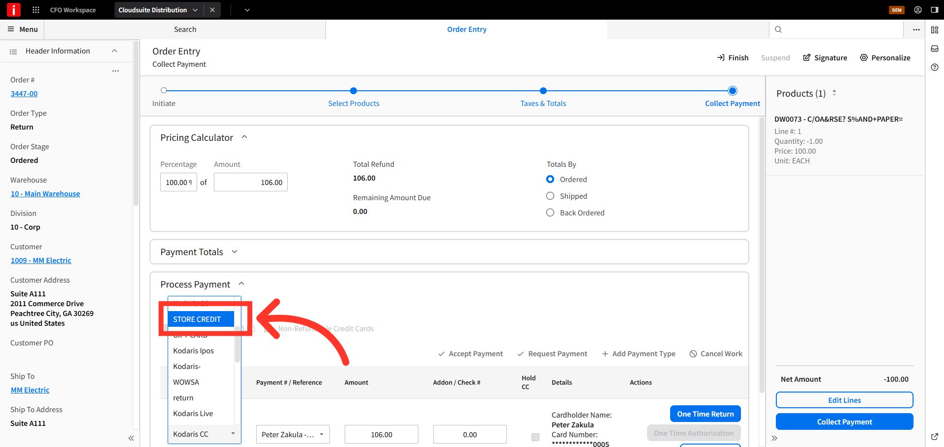 In the "Payment Type" field, choose the "Store Credit" option to apply the refund as credit to the customer's account.