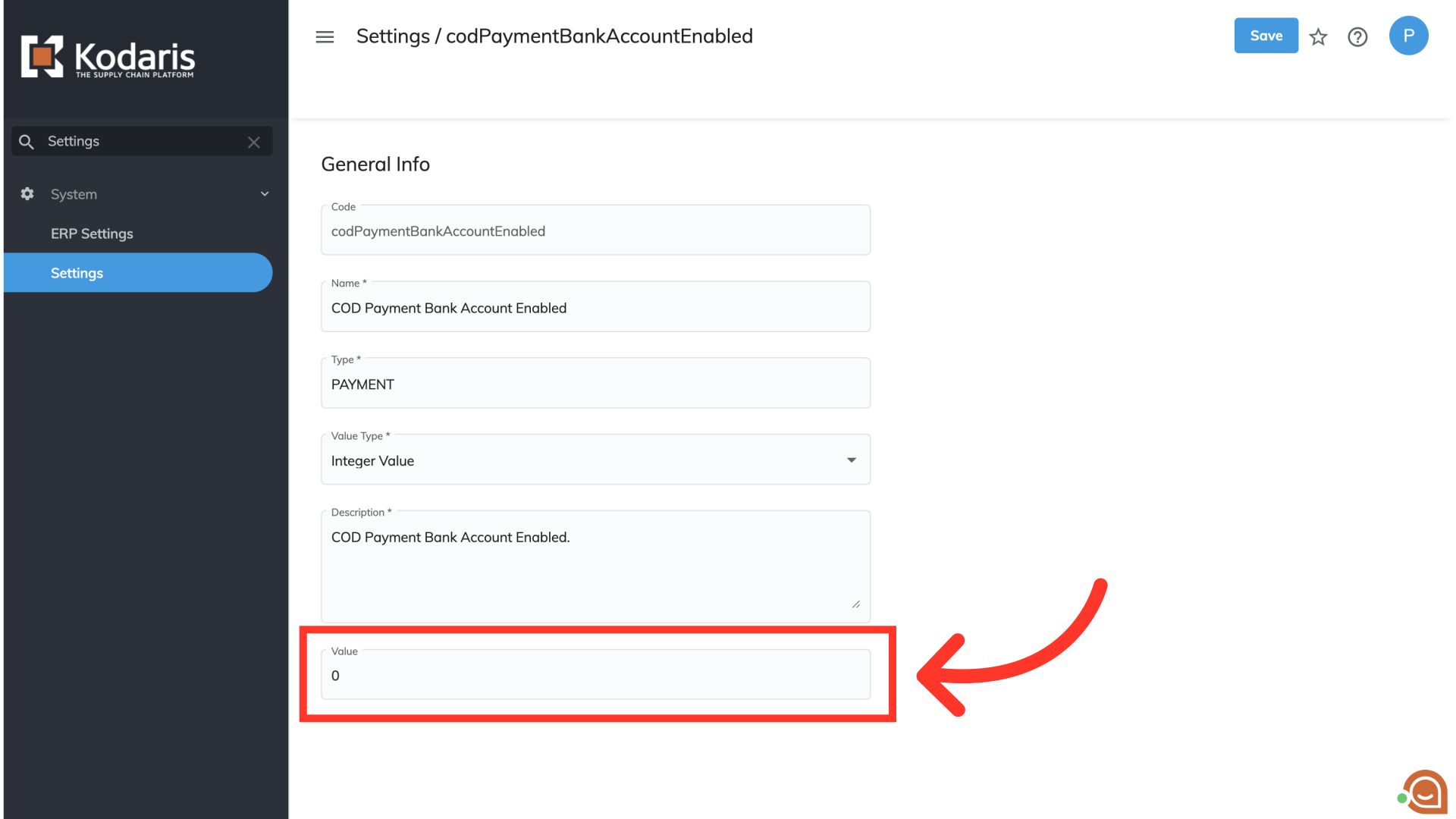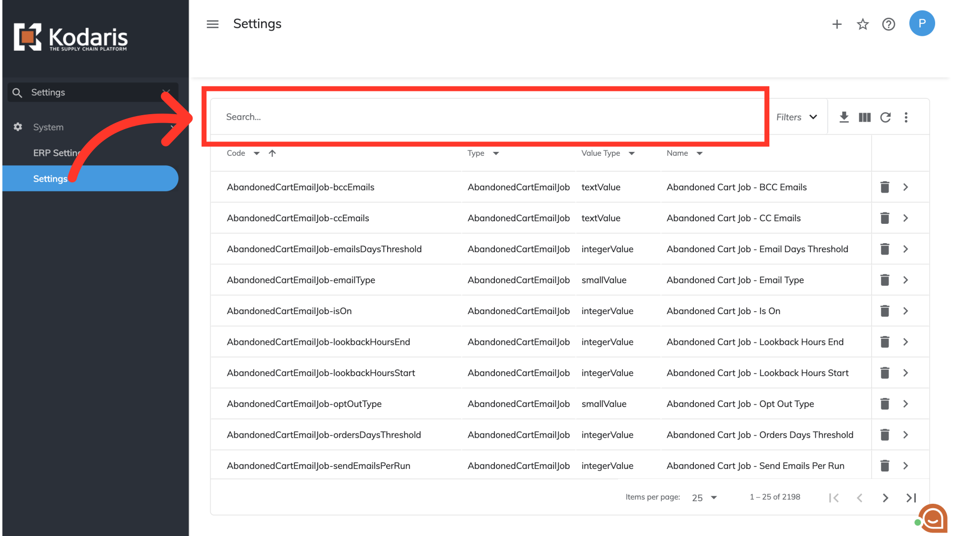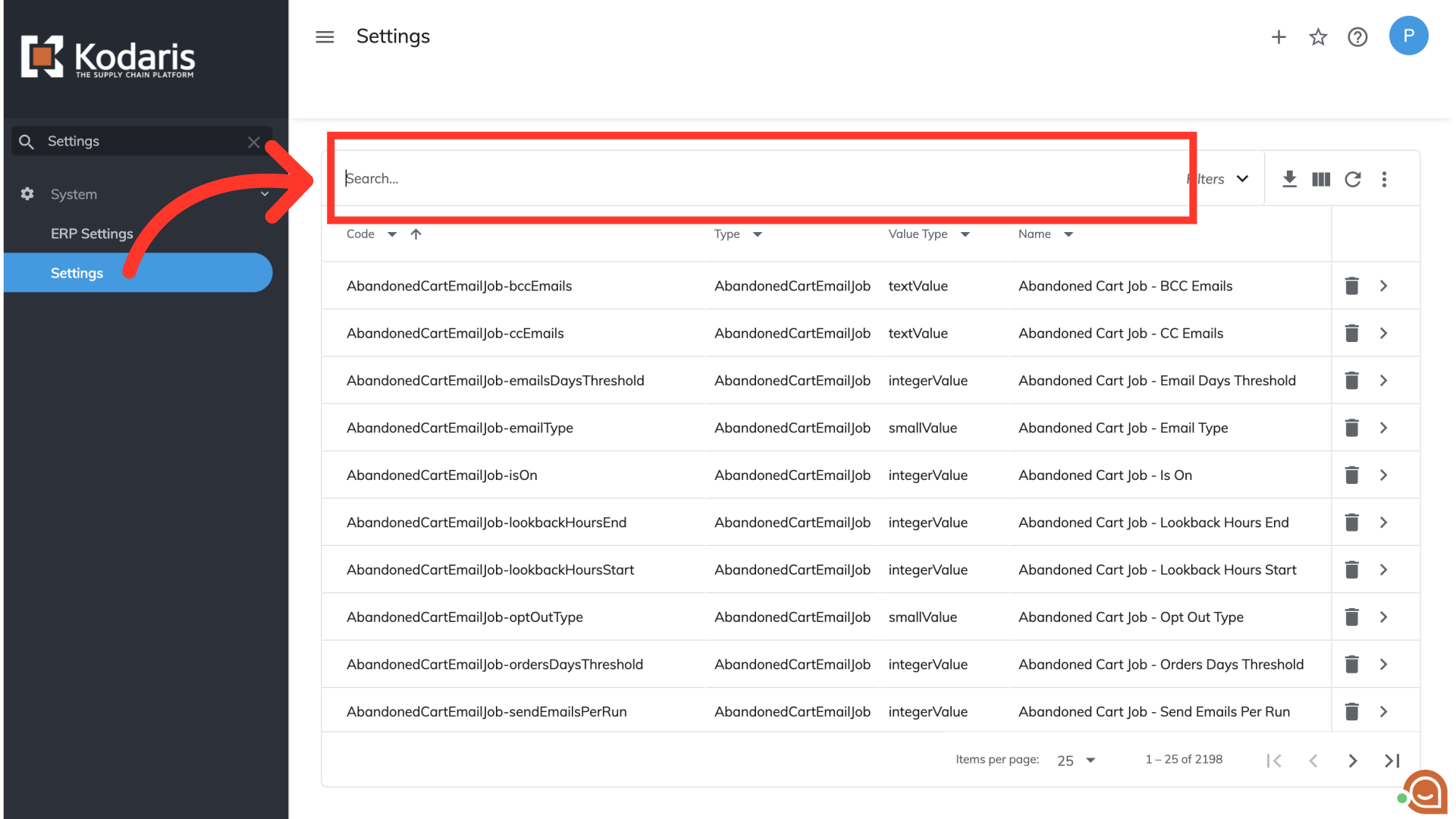 When enabling ACH / EFT payments for COD, you will need to change two settings. To do this, you will need to have the roles of "administrator", "superuser", or "settingEdit". To search for the first setting, type "CODPaymentBankAccountEnabled" into the search bar.