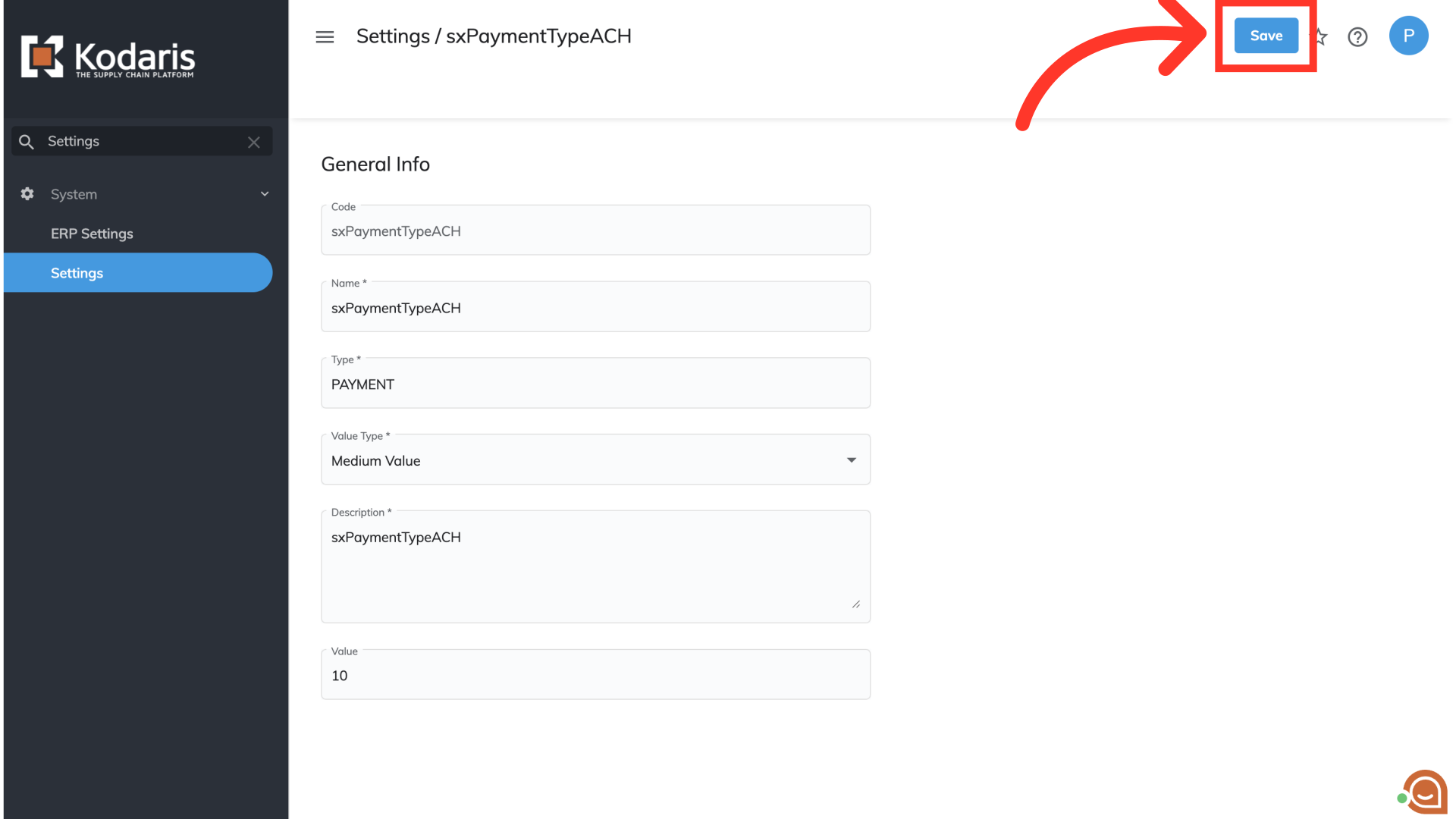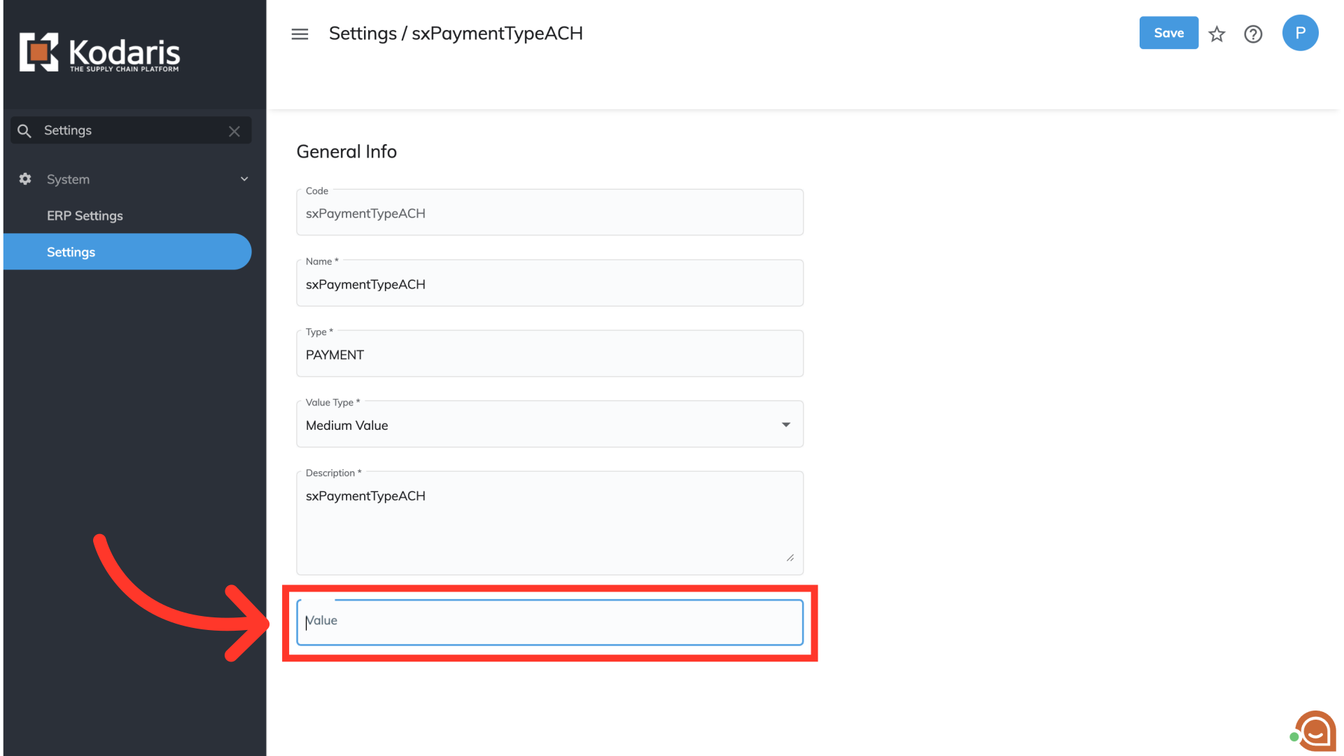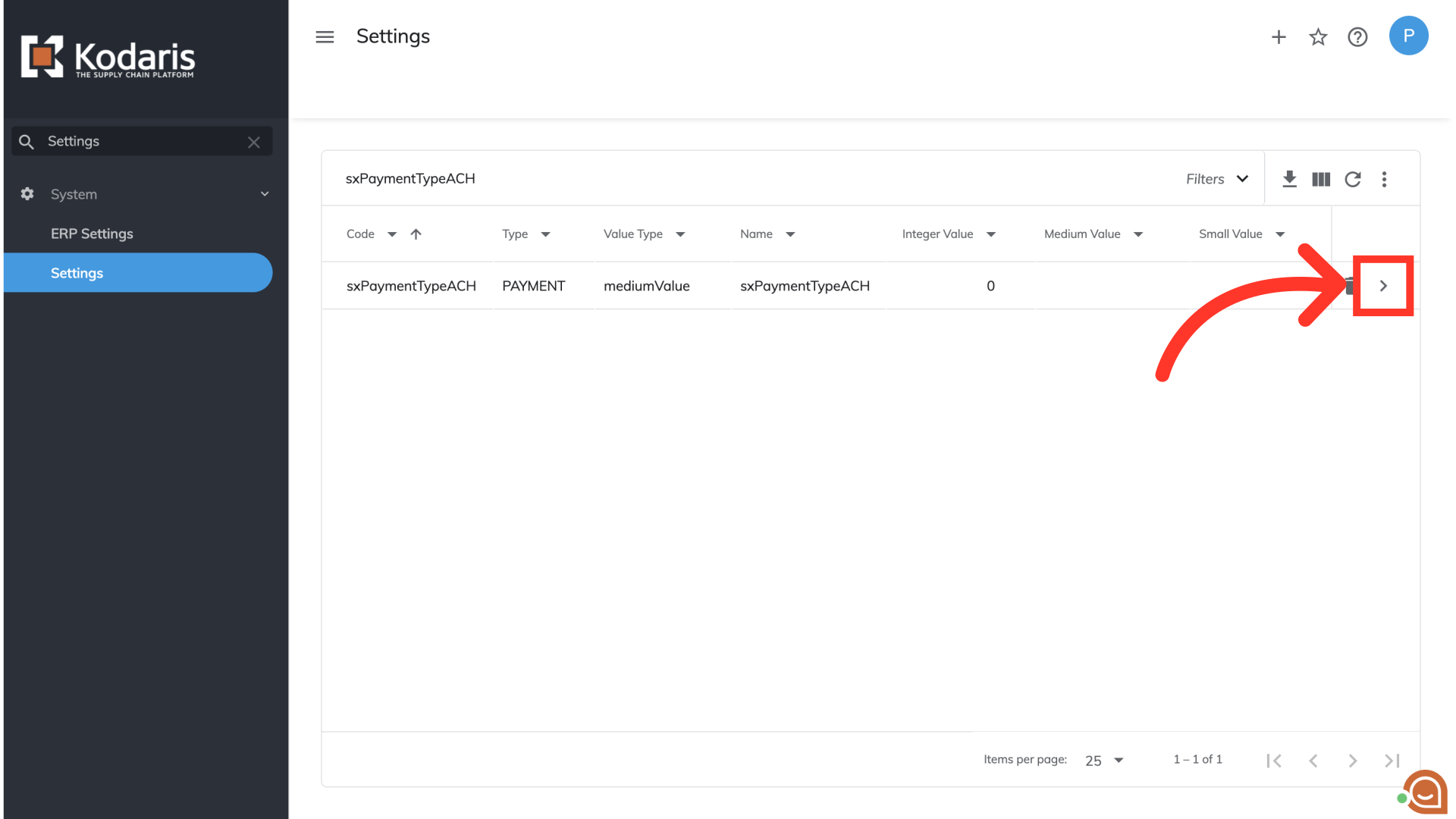 Head back to the "Settings" screen. Search for the second setting you will need to change by typing "sxPaymentTypeACH" into the search bar.
