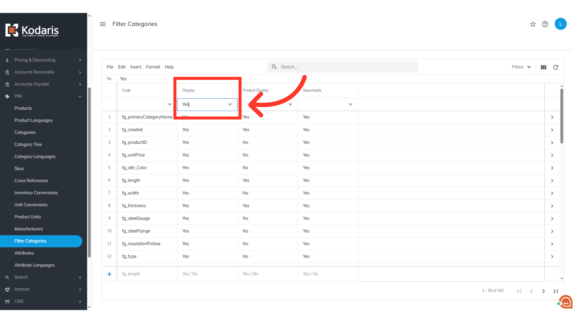 The grid will display the filter categories where both the "Display" and "Product Display" column is "Yes" and "Searchable" is "No".