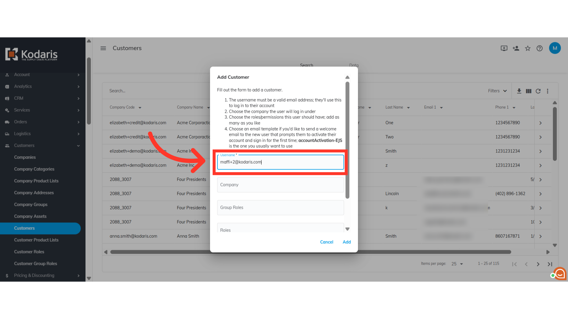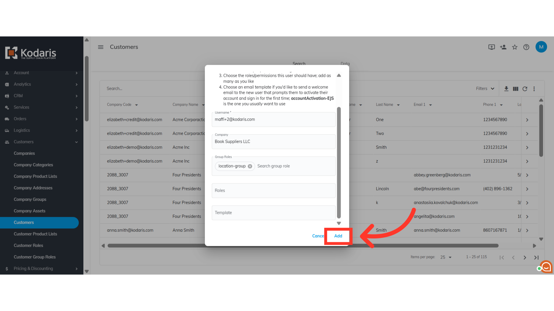 Click "Add" to add the new customer. Group role(s) are also assigned to the new customer.