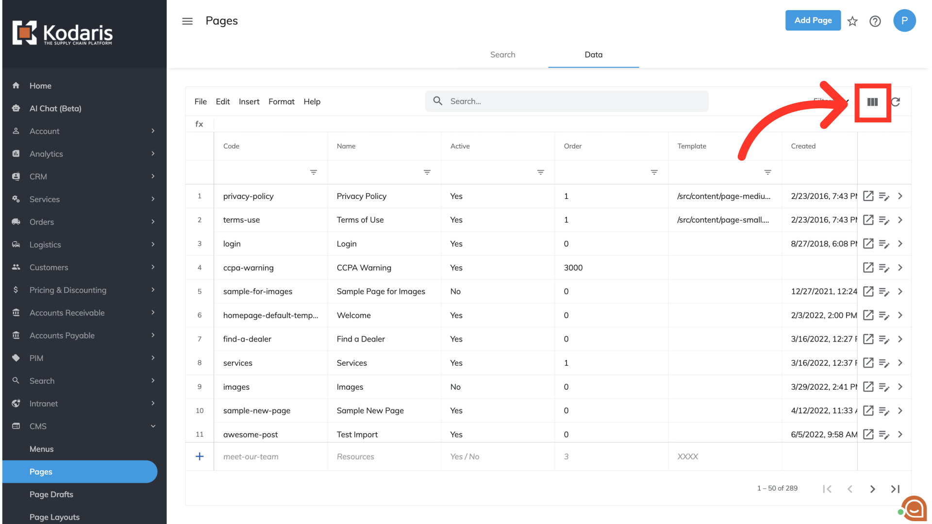 In order to run an import, it is helpful to first run an export so that the CSV file you will eventually import contains the correct fields. To run an export, you will need to add the required fields to your grid view. To get started, click on the "Show/Hide Columns" icon.