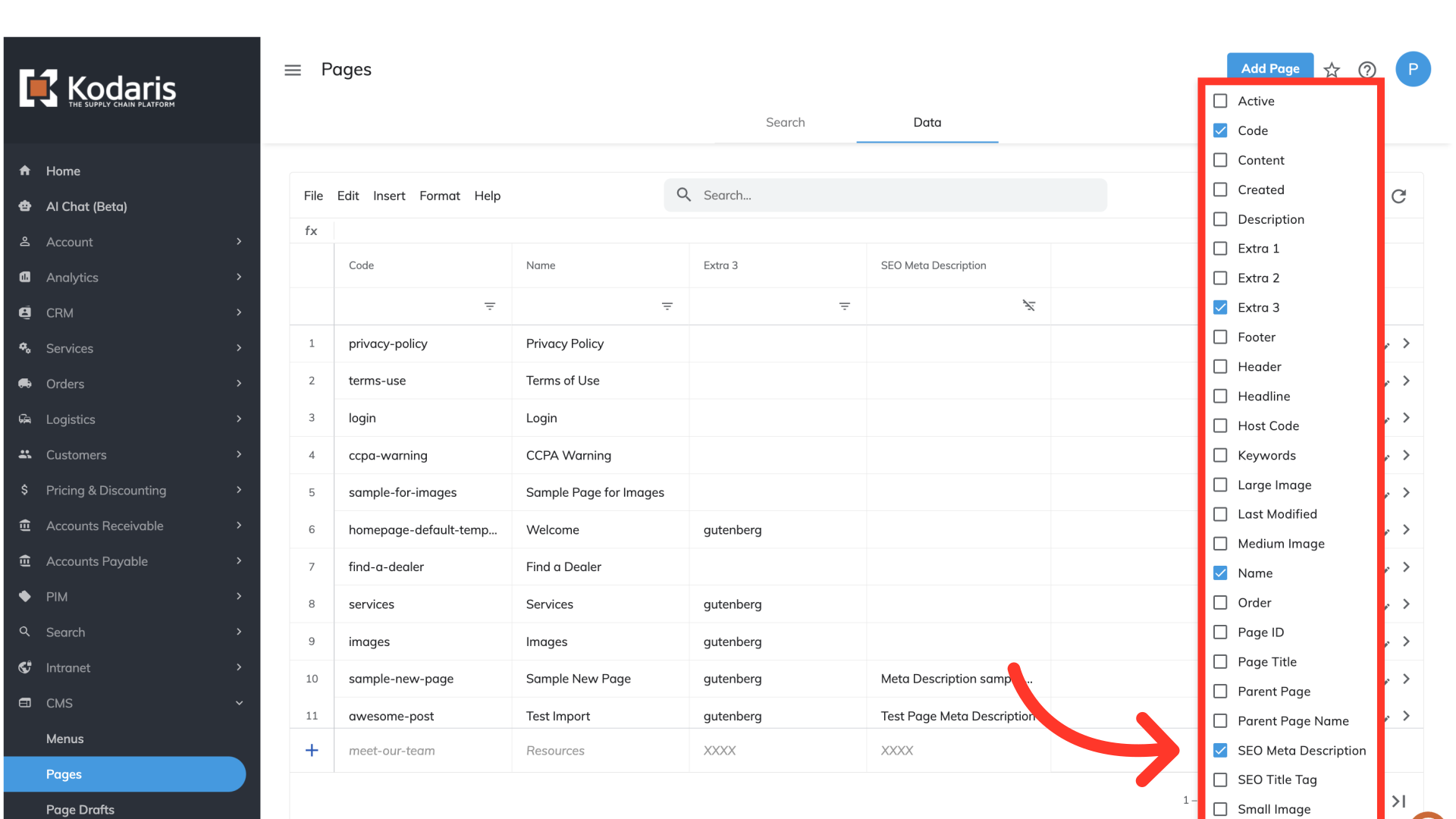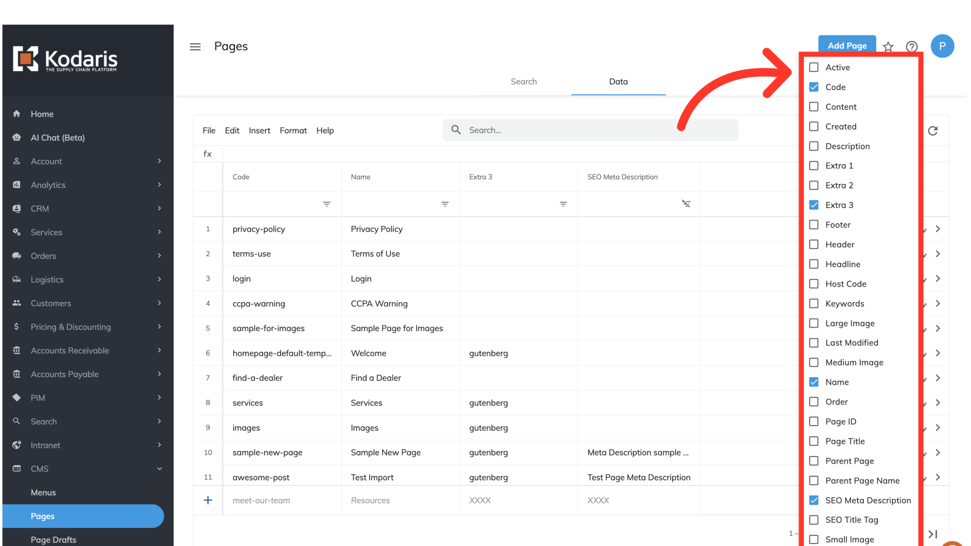 The one required field you must include in your export if you are importing data is "Code". The "Code" is the identifying factor for matching information. "Extra 3" is not required, but does identify the type of content page and can also be helpful to specify between CMS pages and HTML pages. You'll want to make sure not to include the "Page ID" and "UUID" fields in your export. These fields should not be updatd.
