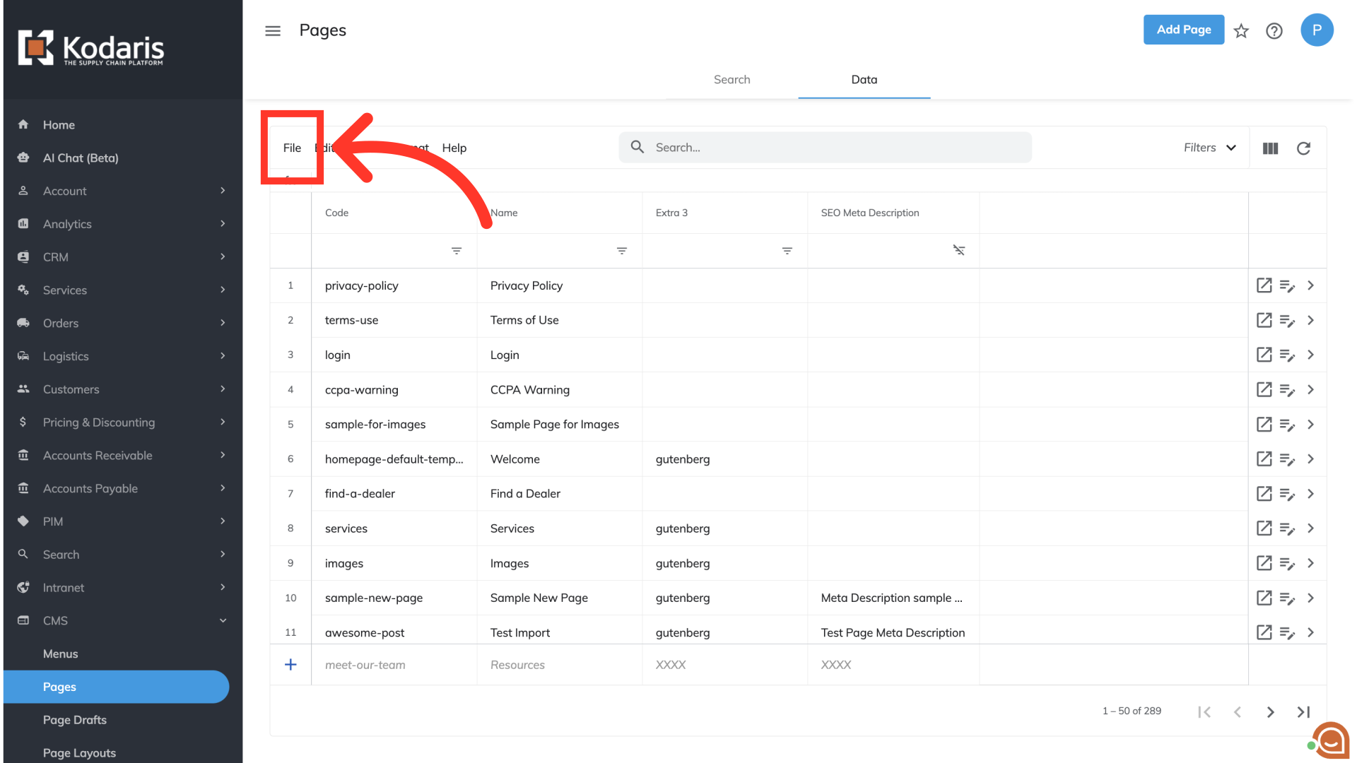 To use the import feature, you will need to access the "Data" tab on the "Pages" screen.
