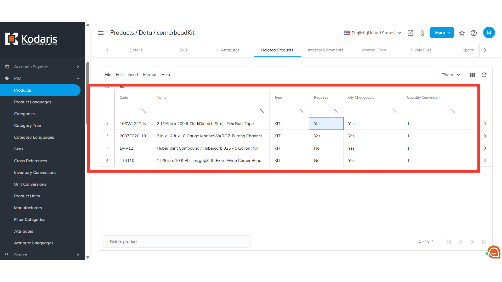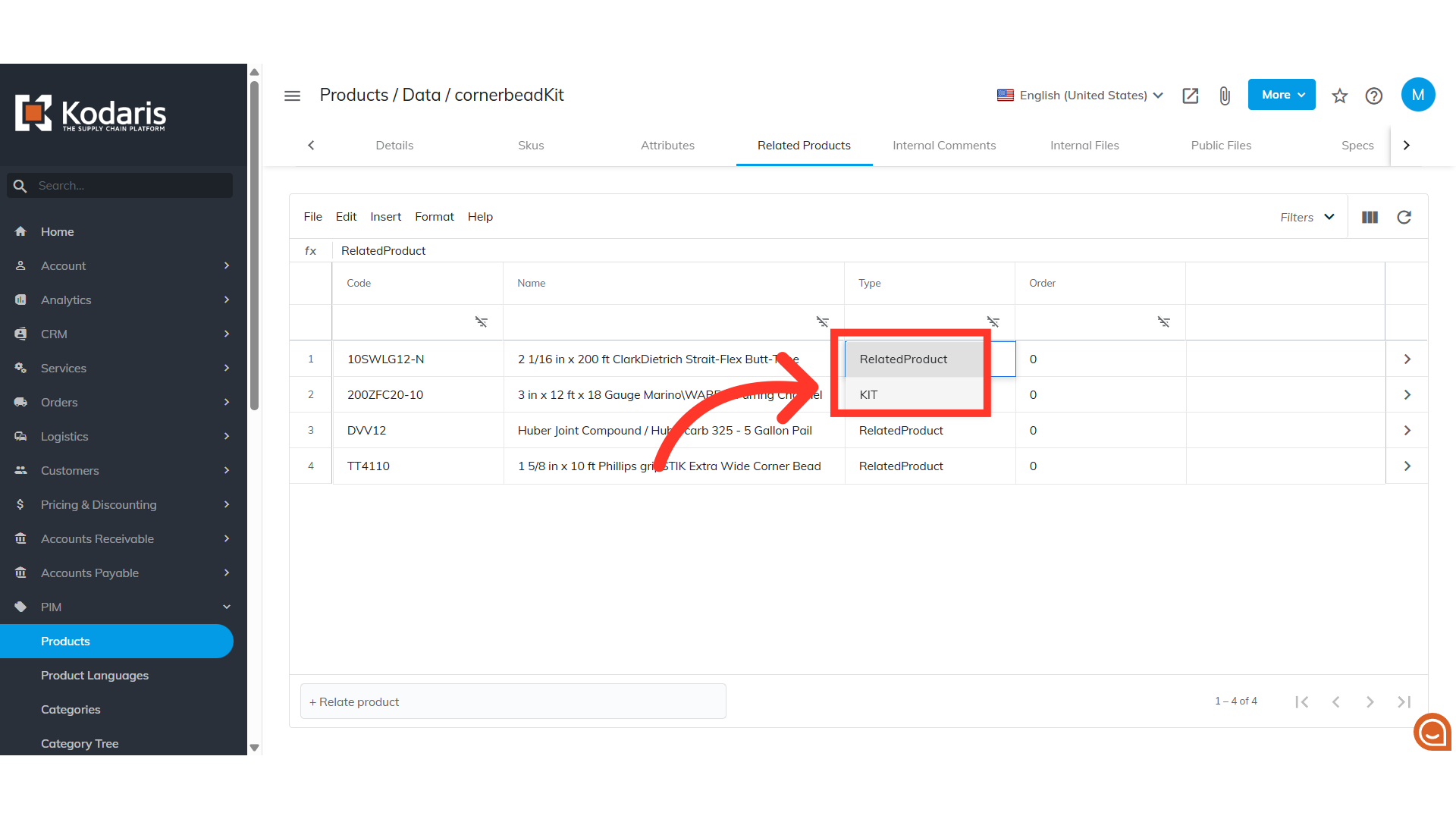 Here, you will add the products that you would like to include in this kit. Click into the "+Relate Product" field. You can also choose to create new product codes that need to be added to your kit. This can be done ahead of time, by using the data grid under Products.