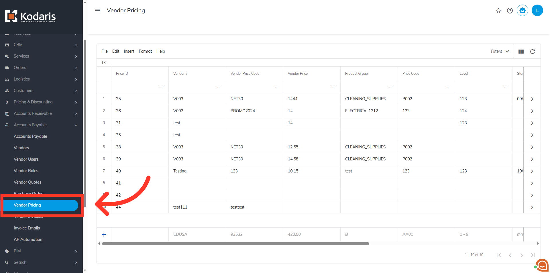 Then, click "Vendor Pricing". In order to access the "Vendor Pricing" screen you will need to be set up either as an "administrator" or a "superuser", or have the appropriate roles: "vendorProductPriceView," and "vendorProductPriceEdit.