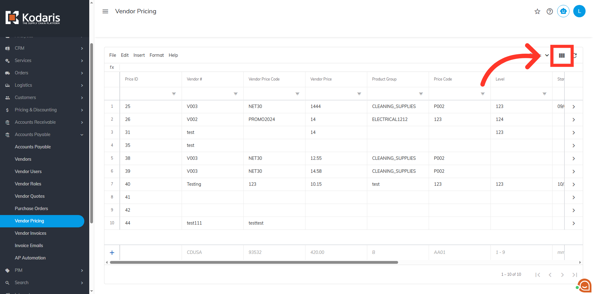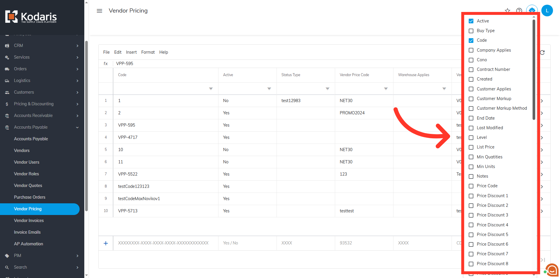 If you would like to export a file that can be used for importing vendor pricing information, you will need the "Code" and "Vendor Price" columns added to the grid. You can also include any other helpful columns if you would like. Uncheck any columns that are not needed to simplify the export file.