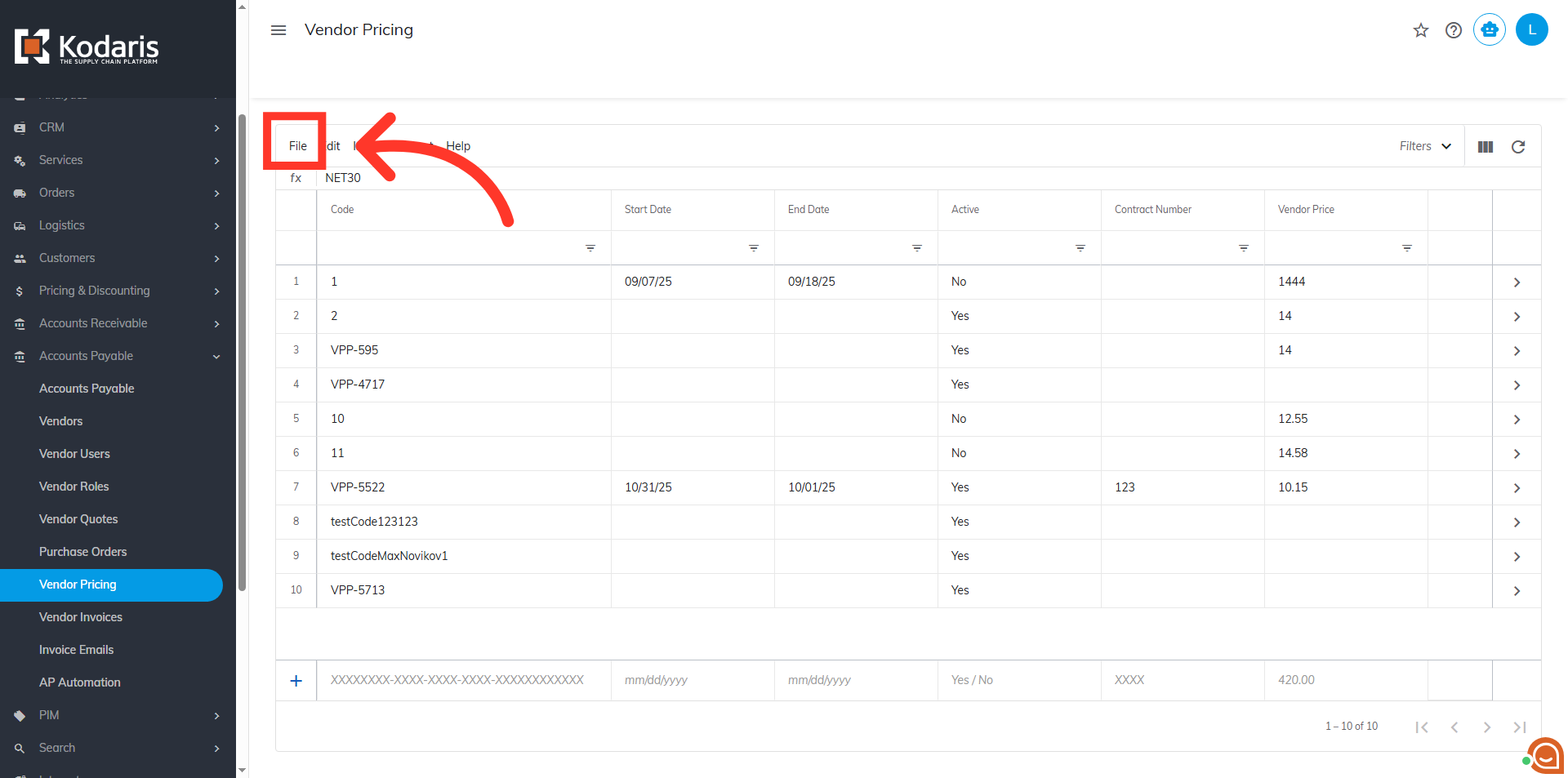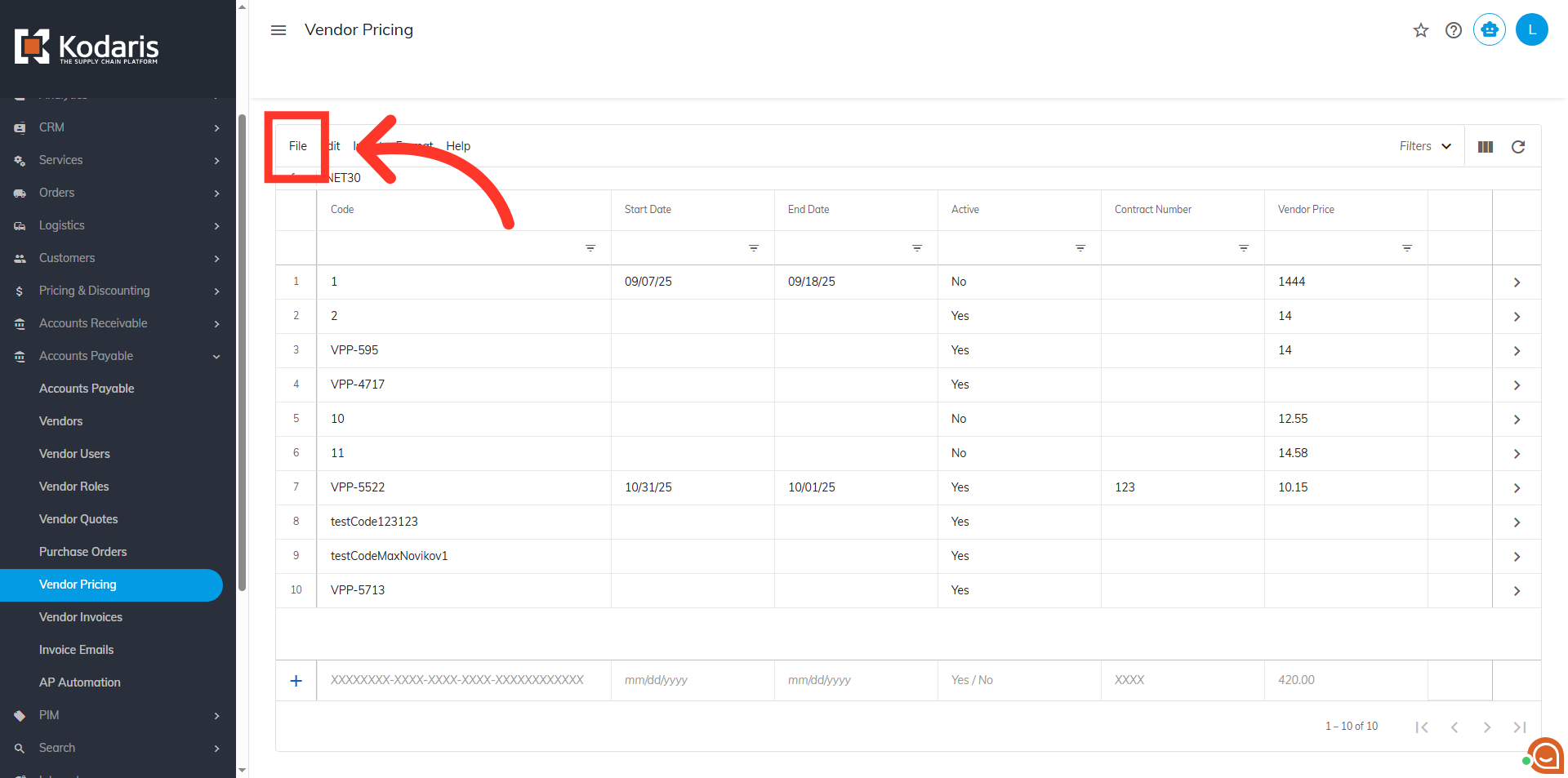 Once the the spreadsheet is ready for import, go back to the "Vendor Pricing" screen, then go to the "File" menu.