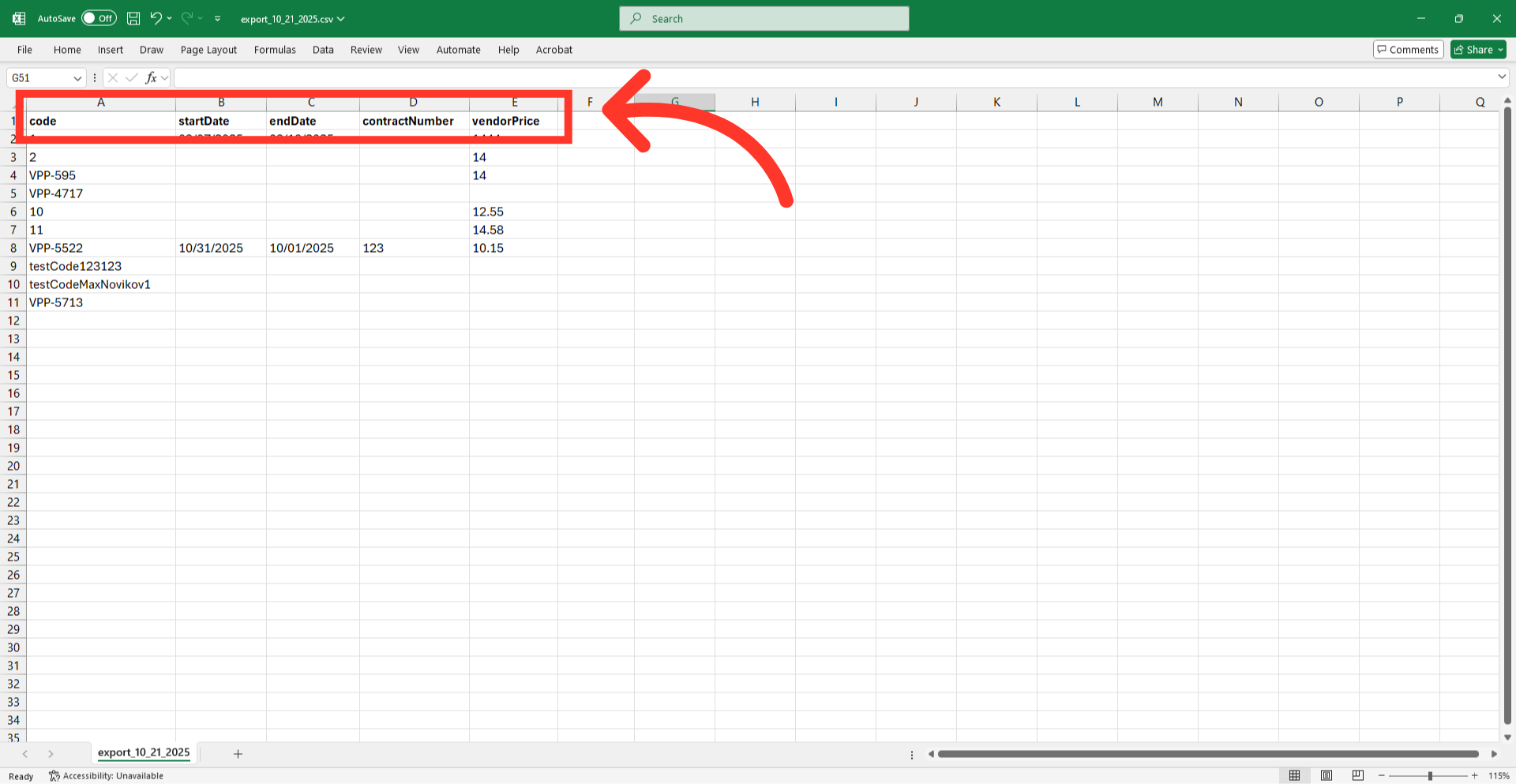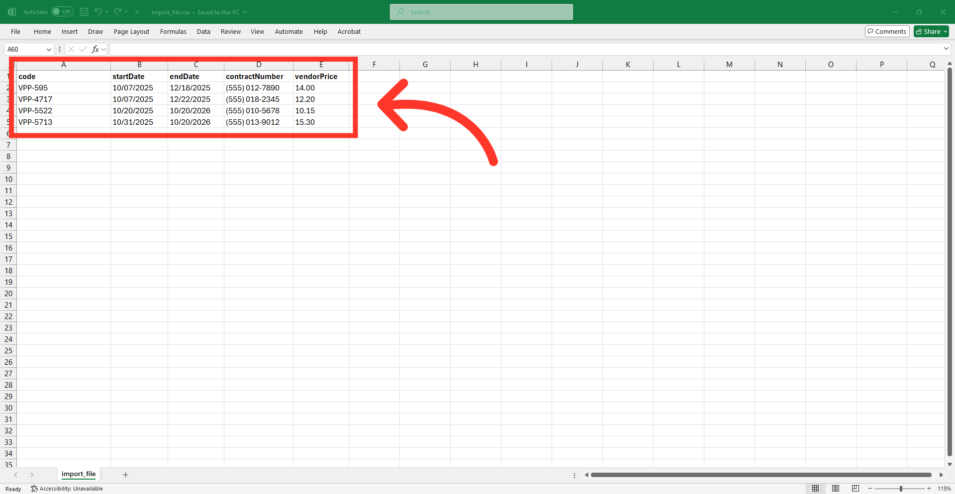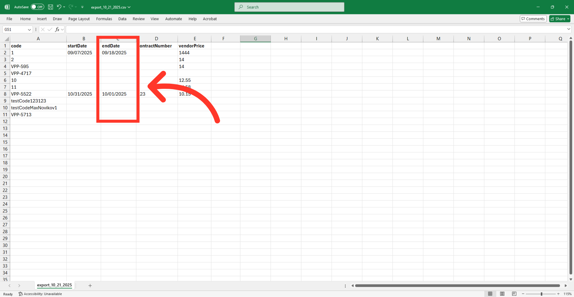"endDate" column contains the expiration dates when a vendor's pricing agreement becomes inactive. The date format needs to match the example in the export, MM/DD/YY.