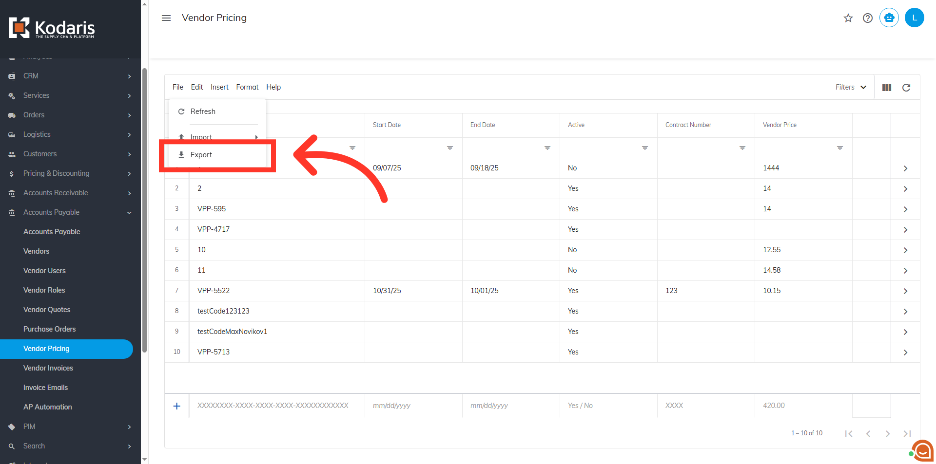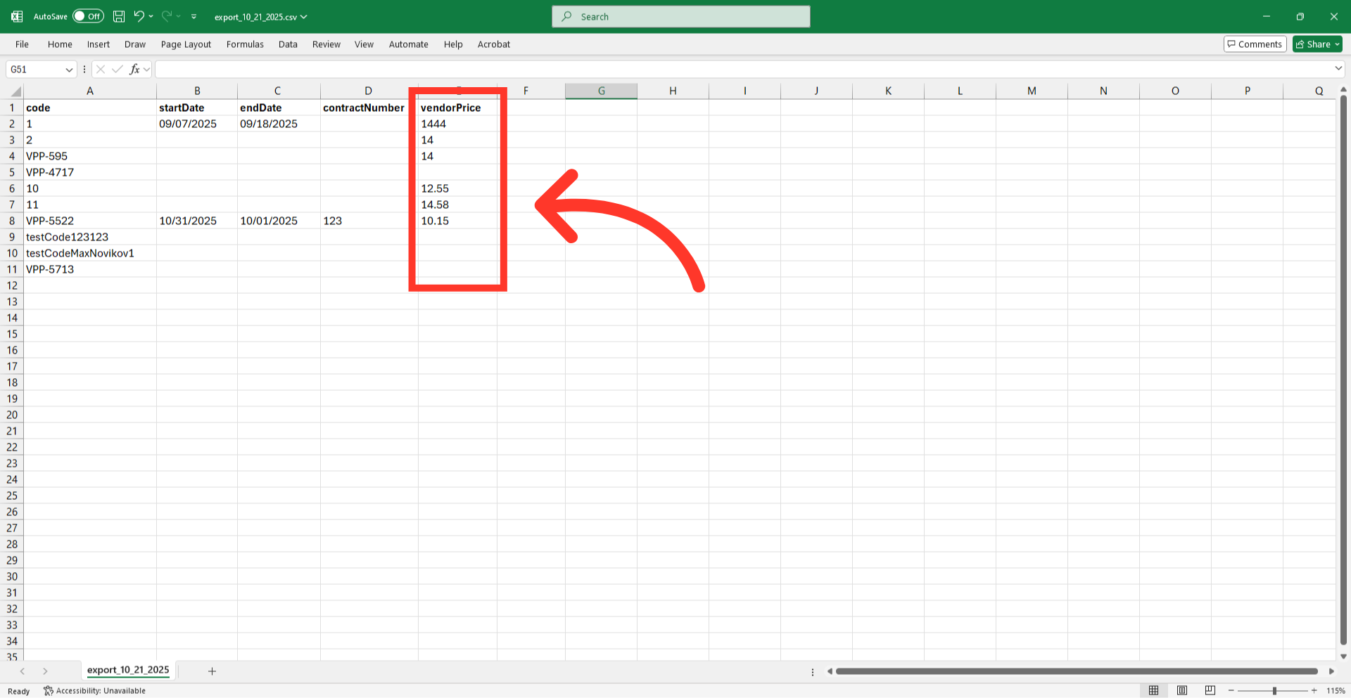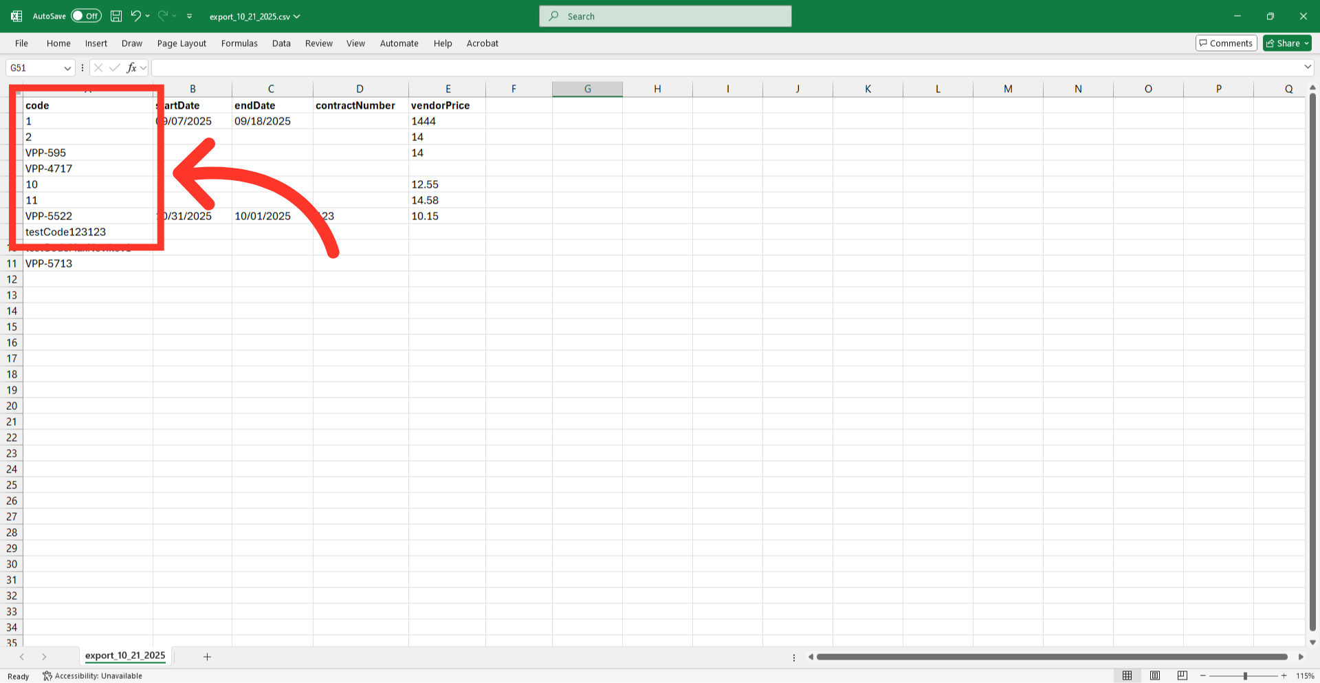 "endDate" column contains the expiration dates when a vendor's pricing agreement becomes inactive. The date format needs to match the example in the export, MM/DD/YY.