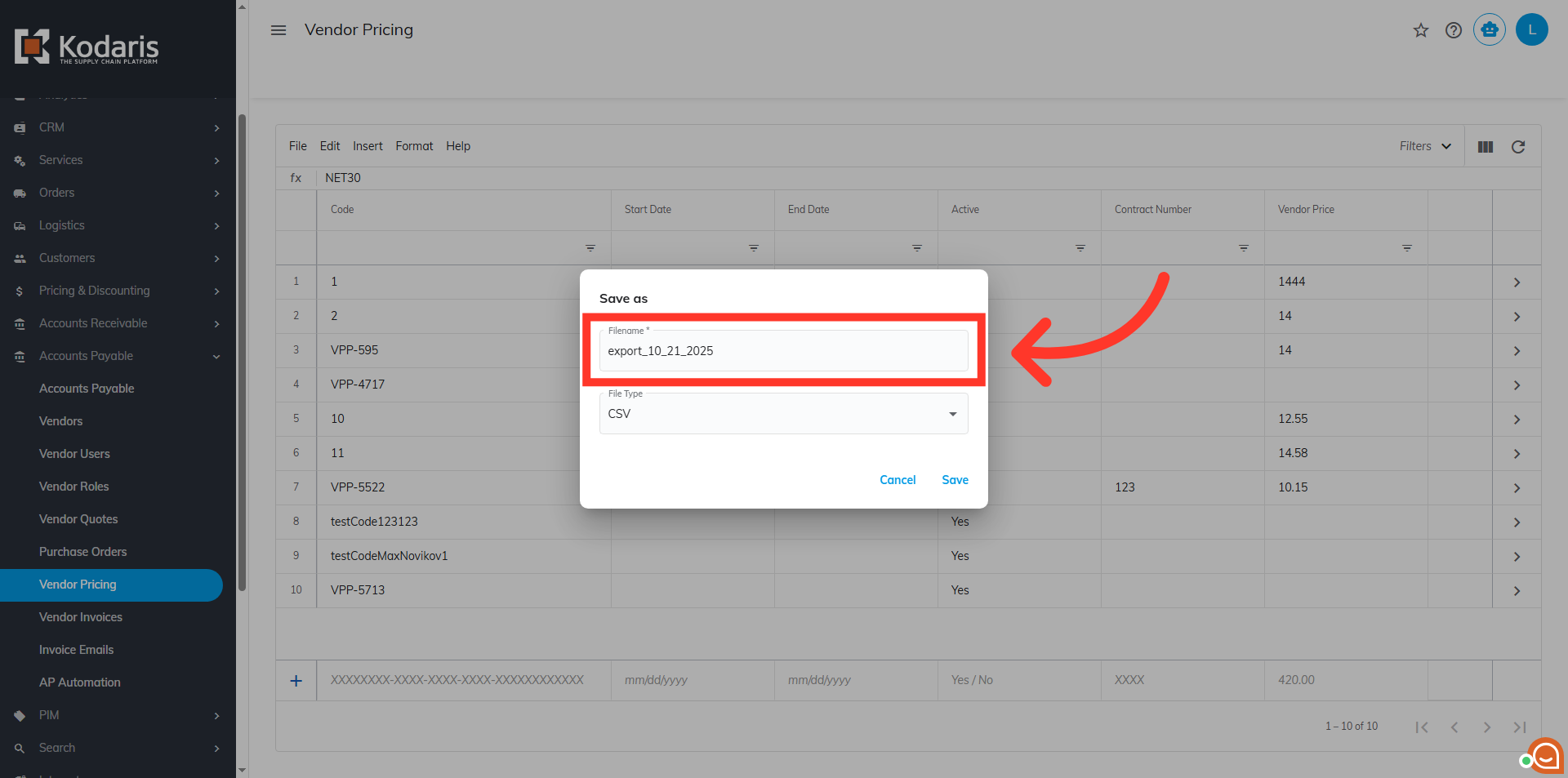 Add new entries or update the existing vendor pricing data. Once you have entered the data that you would like to add to the system, save your spreadsheet as .CSV file which is spreadsheet compatible and your file is ready to import. Be sure the spreadsheet you are using only contains the data that you would like to update by import. If you remove data from a cell, the data imported into the system will be blank for that field for that code.