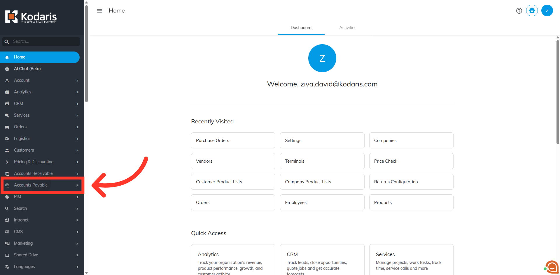 To add items to an existing purchase order, you will need to first navigate to the "Accounts Payable" section in the Operations Portal.