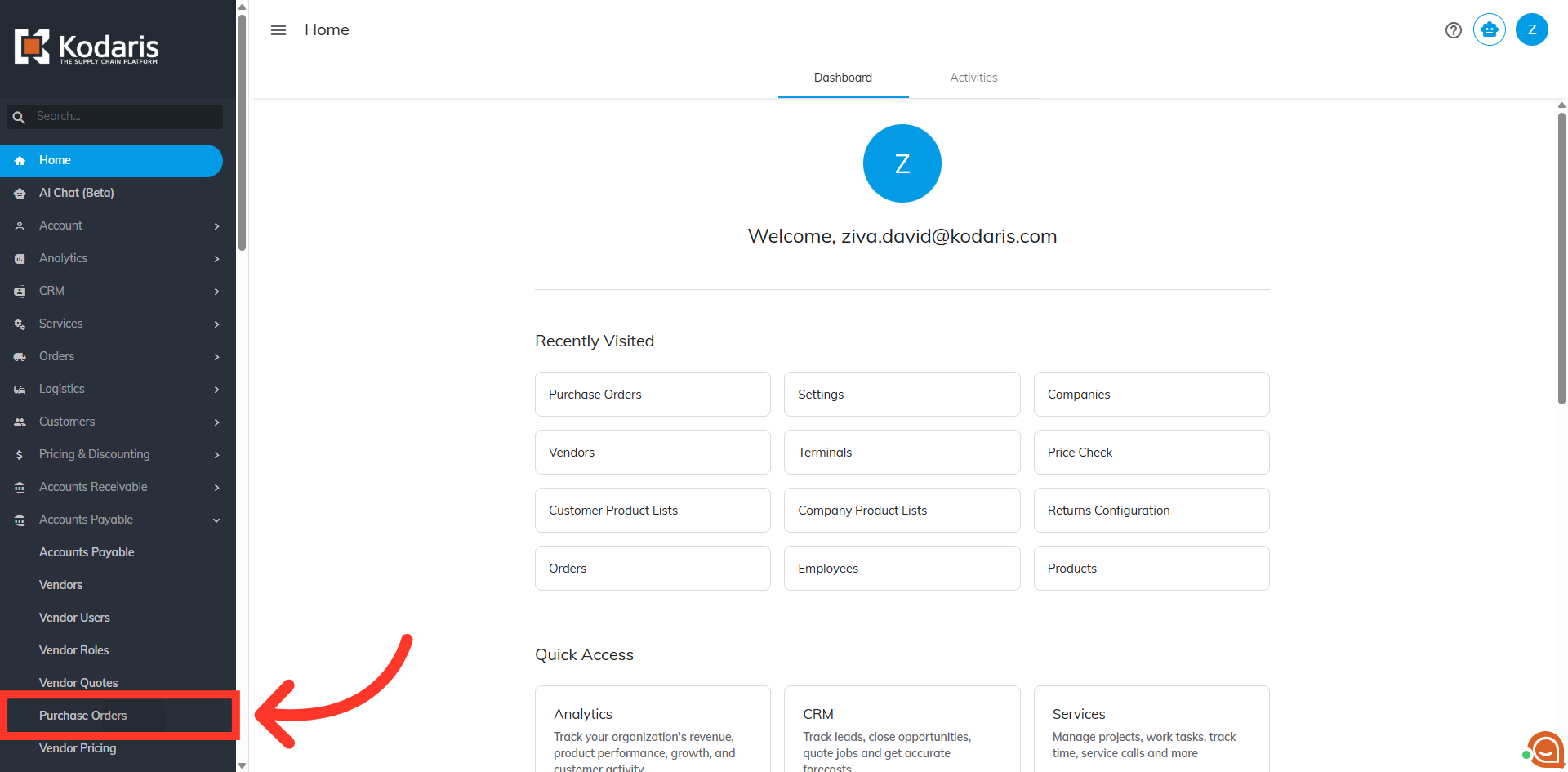 Then, click "Purchase Orders". In order to access and update "Purchase Orders" you will need to be set up either as an "administrator" or a "superuser", or have the roles of: "purchaseOrderView", and "purchaseOrderEdit". To be able to add items, the following roles are needed: "productView", "productEdit", and "orderEdit".