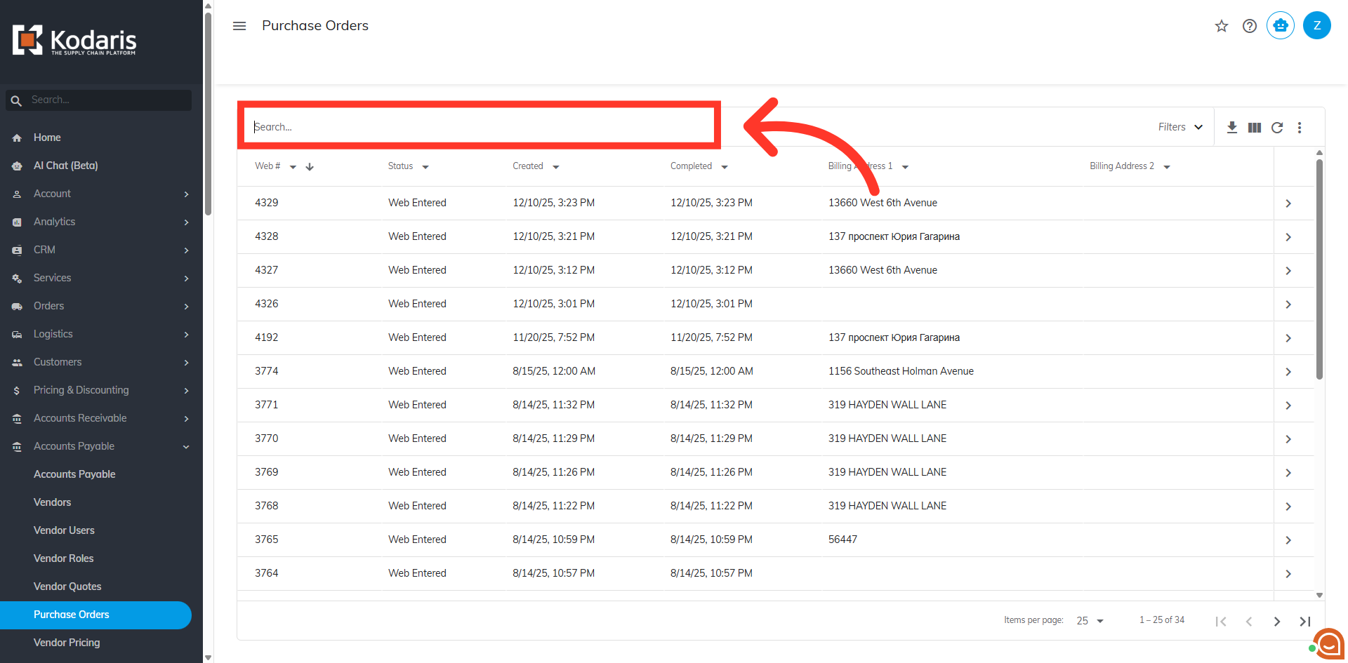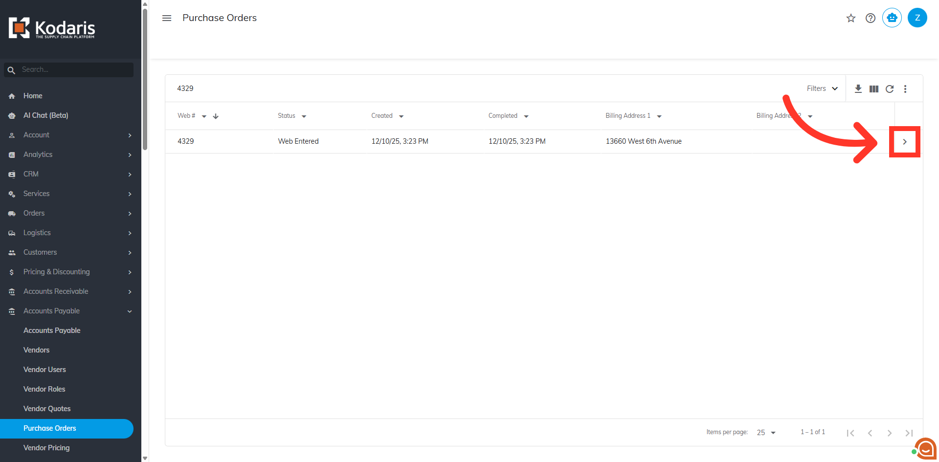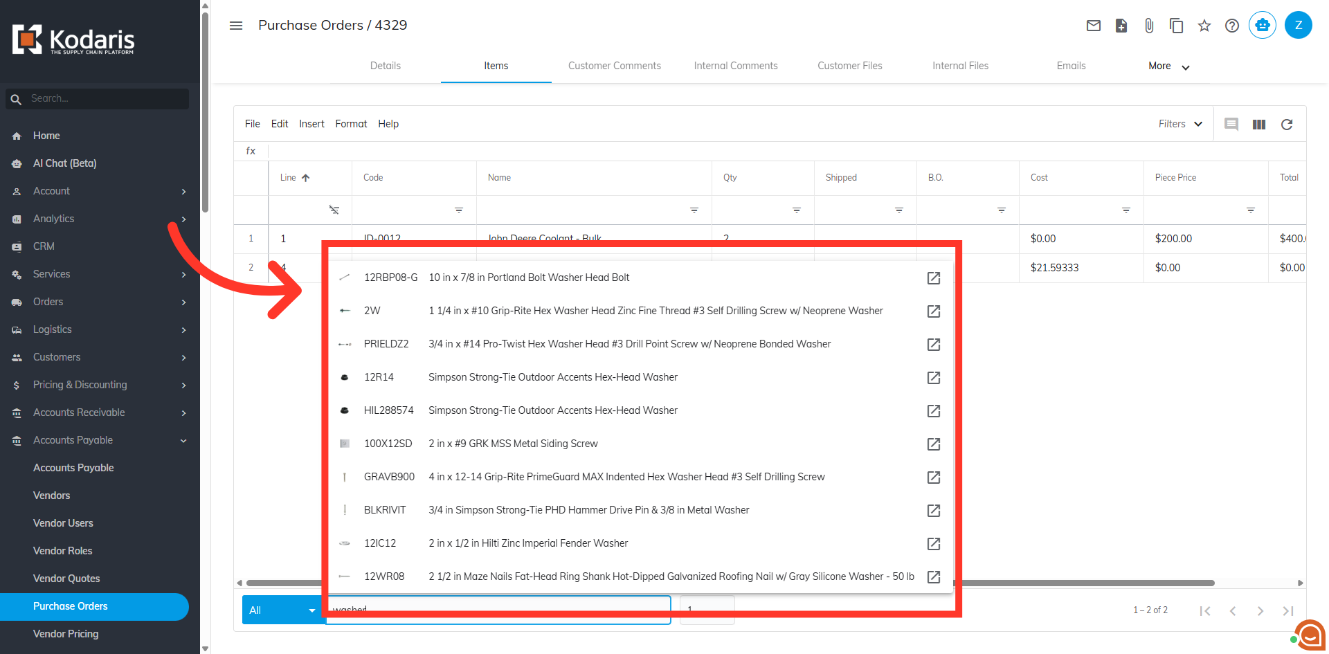 Using the search field, search for the purchase order number you wish to add items to, or select one from the grid list view.